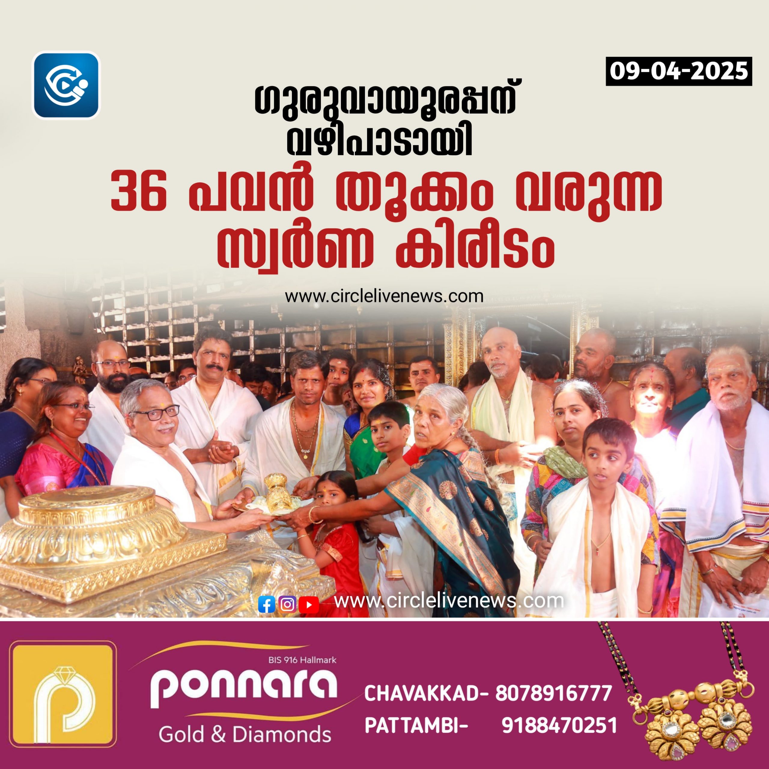 ഗുരുവായൂർ: ഗുരുവായൂരപ്പന് വഴിപാട് സമർപ്പണമായി 36 പവൻ തൂക്കം വരുന്ന സ്വർണ കിരീടം. തമിഴ്നാട് കല്ലാക്കുറിച്ചി സ്വദേശിയായ കുലോത്തുംഗൻ എന്ന ഭക്തനാണ് സ്വർണ്ണ കിരീടം സമർപ്പിച്ചത്. രാവിലെ ഒമ്പതിന് കൊടിമരത്തിന് സമീപം നടന്ന ചടങ്ങിലായിരുന്നു സമർപ്പണം. ദേവസ്വം ചെയർമാൻ ഡോ.വി.കെ വിജയൻ കിരീടം ഏറ്റുവാങ്ങി. അഡ്മിനിസ്ട്രേറ്റർ കെ.പി വിനയൻ, ക്ഷേത്രം ഡെപ്യൂട്ടി അഡ്മിനിസ്ട്രേറ്റർ പ്രമോദ് കളരിക്കൽ, ക്ഷേത്രം അസി.മാനേജർമാരായ കെ രാമകൃഷ്ണൻ, കെ.കെ സുഭാഷ്, സി.ആർ ലെജുമോൾ ,വഴിപാടുകാരനായ കുലോത്തുംഗന്റെ ഭാര്യ രേണുകാദേവി, മക്കൾ എന്നിവർ സന്നിഹിതരായി. സമർപ്പണശേഷം ദർശനം കഴിഞ്ഞുവന്ന കുലോത്തുംഗനും കുടുംബത്തിനും കളഭം, കദളിപ്പഴം, പഞ്ചസാര, ചാർത്തിയ തിരുമുടിമാല, പട്ട് എന്നിവ അടങ്ങിയ ശ്രീഗുരുവായൂരപ്പൻ്റെ പ്രസാദകിറ്റ് നൽകി.