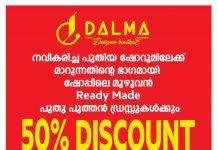 DALMA designer boutique നവീകരിച്ച പുതിയ ഷോറൂമിലേക്ക് മാറുന്നതിന്റെ ഭാഗമായി ഷോപ്പിലെ മുഴുവൻ Readymade വസ്ത്രങ്ങൾക്കും 50 % Discount available items,Churidhar, Kurthies, Tops, Gown, Frock, Cord set, Jeans, Lacha, Choli, Shirts, Crop tops, Abaya, Pardha, Maxi, Nighty. ഈ ഓണം കളറാക്കാം ഡൽമയൊടൊപ്പം… DALMA designer boutiqueMadheena buildingNorth bypassChavakkad.Mobile: 9526138888