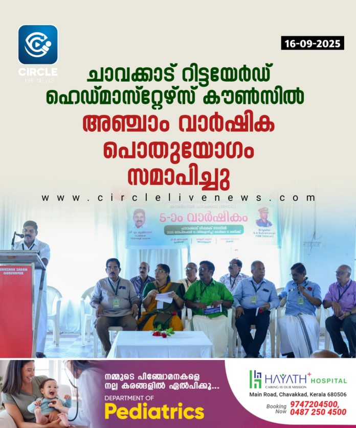 ചാവക്കാട്: ചാവക്കാട് റിട്ടയേർഡ് ഹെഡ്മാസ്റ്റേഴ്സ് കൗൺസിലിൻ്റെ അഞ്ചാം വാർഷിക പൊതുയോഗം സമാപിച്ചു. മുതുവട്ടൂർ ശിക്ഷക് സദനിൽ ചേർന്ന വാർഷിക പൊതുയോഗം ഗുരുവായൂർ നഗരസഭ ചെയർമാൻ എം കൃഷ്ണദാസ് ഉദ്ഘാടനം ചെയ്തു. പ്രസിഡണ്ട് പി.വി ബാലചന്ദ്രൻ അധ്യക്ഷത വഹിച്ചു. കാർഗിൽ യുദ്ധത്തിൽ 315 ഫീൽഡ് കമാൻ്റിങ്ങ് ഓഫീസറായി യുദ്ധ സേവ മെഡലിന് അർഹനായ ബ്രിഗേഡിയർ എൻ. എ. സുബ്രഹ്മണ്യനെ ഉപഹാരം നൽകി ആദരിച്ചു. ബ്രില്യൻ്റ് വർഗീസ്, തോംസൺ വാഴപ്പിള്ളി, പി.ഐ ലാസർ, ടി.കെ ഉണ്ണികൃഷ്ണൻ, എം.എഫ് ജോയ്, ടി.എസ്.മല്ലിക, പി.ബി കൃഷ്ണകുമാർ എന്നിവർ സംസാരിച്ചു. ഭാരവാഹികളായി പ്രസിഡണ്ട് – ഇ ഉഷ, സെക്രട്ടറി – തോംസൺ വാഴപ്പിള്ളി, ട്രഷറർ -ആൻ്റണി ഒലക്കേങ്കിൽ എന്നിവരെയും തെരഞ്ഞെടുത്തു.