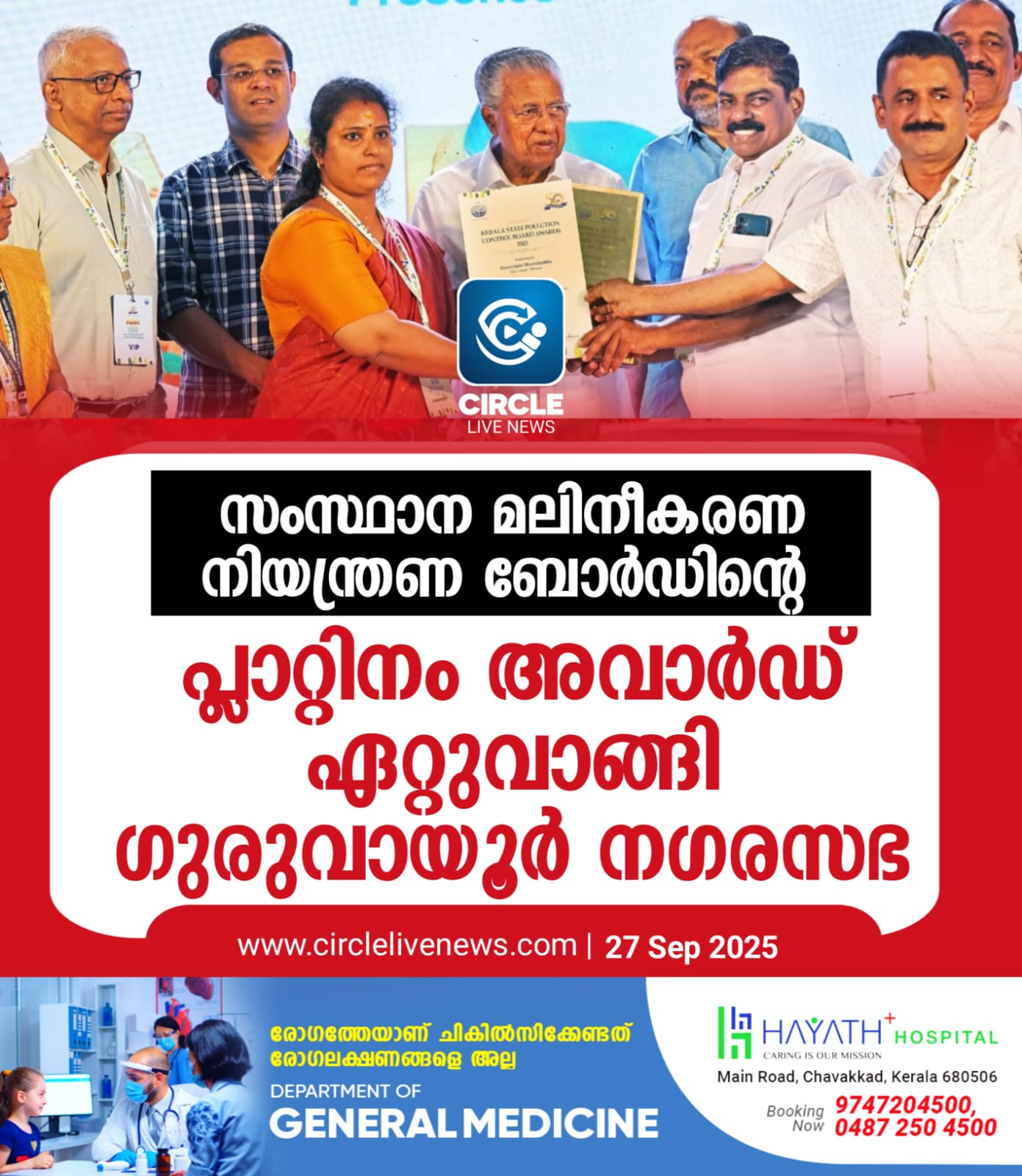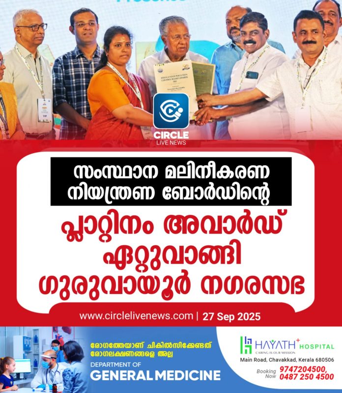 ഗുരുവായൂർ: സംസ്ഥാന മലിനീകരണ നിയന്ത്രണ ബോർഡിൻ്റെ പ്ലാറ്റിനം അവാർഡ് ഏറ്റുവാങ്ങി ഗുരുവായൂർ നഗരസഭ. മുഖ്യമന്ത്രി പിണറായി വിജയനിൽ നിന്നും നഗരസഭ ചെയർമാൻ എം.കൃഷ്ണദാസ്, വൈസ് ചെയർപേഴ്സൺ, അനിഷ്മ ഷനോജ് എന്നിവർ ചേർന്ന് പുരസ്കാരം ഏറ്റുവാങ്ങി. എറണാകുളം കറുകുറ്റി അഡ്ലക്സ് ഇന്റർനാഷണൽ കൺവെൻഷൻ സെന്ററിലെ അന്താരാഷ്ട്ര പരിസ്ഥിതി കോൺക്ലേവ് വേദിയിൽ നടന്ന ചടങ്ങിൽ വ്യവസായ മന്ത്രി പി രാജീവ് അദ്ധ്യക്ഷത വഹിച്ചു. ഗുരുവായൂർ നഗരസഭ സ്റ്റാൻ്റിംഗ് കമ്മിറ്റി ചെയർമാൻമാരായ എ.എം ഷെഫീർ , ഷൈലജ സുധൻ, ബിന്ദു അജിത്, നഗരസഭ സെക്രട്ടറി എച്ച് അഭിലാഷ് കുമാർ, ക്ലീൻ സിറ്റി മാനേജർ അശോക് കുമാർ എന്നിവർ സന്നിഹിതരായി. പരിസ്ഥിതി സംരക്ഷണത്തിലും മലിനീകരണ നിയന്ത്രണത്തിലും നേട്ടങ്ങൾ കൈവരിച്ചതിനാണ് ഗുരുവായൂർ നഗരസഭയെ സംസ്ഥാന മലിനീകരണ നിയന്ത്രണ ബോർഡിൻ്റെ പ്ലാറ്റിനം അവാർഡിനായി തെരഞ്ഞെടുത്തത്.
