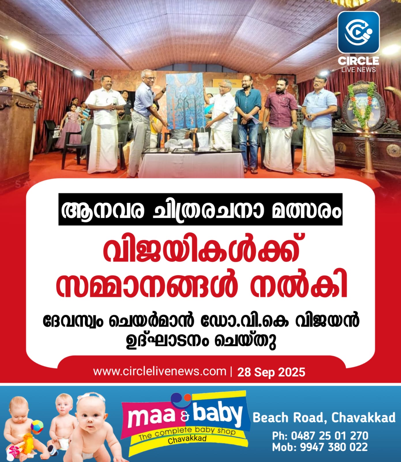 ഗുരുവായൂർ: ഗുരുവായൂർ ദേവസ്വവും മാതൃഭൂമിയും സംയുക്താഭിമുഖ്യത്തിൽ നടത്തിയ ആനവര ചിത്രരചനാ മത്സരത്തിലെ വിജയികൾക്കുള്ള ഉപഹാരങ്ങൾ സമ്മാനിച്ചു. ശ്രീ ഗുരുവായൂരപ്പൻ ഓഡിറ്റോറിയത്തിൽ നടന്ന ചടങ്ങ് ദേവസ്വം ചെയർമാൻ ഡോ.വി.കെ വിജയൻ ഉദ്ഘാടനം ചെയ്തു. ക്ഷേത്രം തന്ത്രി ബ്രഹ്മശ്രീ പി.സി ദിനേശൻ നമ്പൂതിരിപ്പാട് ഭദ്രദീപം തെളിച്ചു. മാതൃഭുമി ചീഫ് ജനറൽ മാനേജർ സജീവൻ നന്നാട്ട് അധ്യക്ഷനായി. കവിയും ഗാന രചയിതാവുമായ കൈതപ്രം ദാമോദരൻ നമ്പൂതിരി, സംഗീത സംവിധായകൻ ഔസേപ്പൻ എന്നിവർ മുഖ്യാതിഥികളായി. ദേവസ്വം ഭരണസമിതി അംഗങ്ങളായ സി മനോജ്, കെ.പി വിശ്വനാഥൻ, അഡ്മിനിസ്ട്രേറ്റർ ഒ.ബി അരുൺകുമാർ, കൗൺസിലർ ശോഭാ ഹരി നാരായണൻ, മാതൃഭൂമി ന്യൂസ് എഡിറ്റർ എം.കെ കൃഷ്ണകുമാർ, യൂണിറ്റ് മാനേജർ വിനോദ് നാരായണൻ, ദേവസ്വം പബ്ബിക്കേഷൻ അസി.മാനേജർ കെ.ജി സുരേഷ് കുമാർ എന്നിവർ സന്നിഹിതരായി.