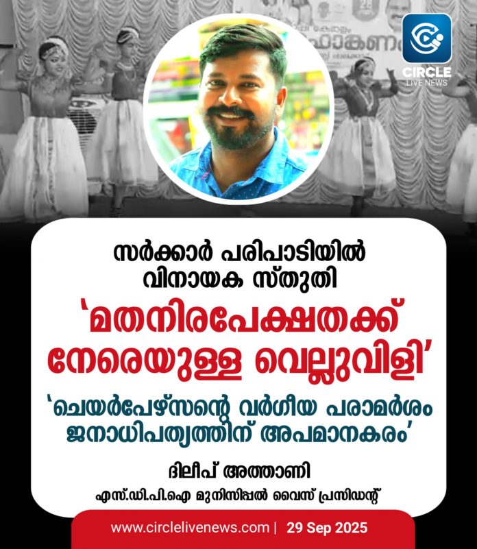 ചാവക്കാട്: ചാവക്കാട് നഗരസഭയിൽ ഹാപ്പി കേരളം പദ്ധതിയുടെ ഉദ്ഘാടന ചടങ്ങിൽ വിനായക സ്തുതി അവതരിപ്പിച്ച സംഭവം പ്രതിഷേധാർഹമാണെന്ന് എസ്.ഡി.പി.ഐ ചാവക്കാട് മുൻസിപ്പൽ കമ്മിറ്റി. മതനിരപേക്ഷത സർക്കാർ പരിപാടികളിൽ മതാചാരങ്ങൾക്ക് ഇടമില്ലെന്നതാണ് ഭരണഘടന വ്യക്തമാക്കുന്നത്. എന്നാൽ ഗുരുവായൂർ എം എൽ.എയും നഗരസഭ ചെയർപേഴ്സണും സംഘാടകരും ചേർന്ന് നടത്തിയ ഈ പ്രവൃത്തി ഭരണഘടനയുടെ ആത്മാവിനെയും പൗരന്മാരുടെ വിശ്വാസ സ്വാതന്ത്ര്യത്തിനെയും അവഹേളിക്കുന്നതാണ്. പൊതു ജനങ്ങളുടെ പണം ചെലവഴിച്ച് നടക്കുന്ന പൊതു പദ്ധതികൾ ഏതെങ്കിലും മതാചാരങ്ങളോട് ബന്ധിപ്പിക്കുന്നത് മറ്റു മതവിശ്വാസികളോട് വിവേചനപരവും പുറത്താക്കലും തന്നെയാണ്. സർക്കാരിന്റെ ഔദ്യോഗിക പരിപാടികൾ മതേതരമായിരിക്കണമെന്ന് ഉറപ്പുവരുത്തുക ഭരണഘടനാപരമായ കടമയാണ്. ഈ രീതിയിലുള്ള പരിപാടികൾ രാജ്യത്തിന്റെ മതേതര ജനാധിപത്യ സ്വഭാവത്തിന് നേരെ നടക്കുന്ന വെല്ലുവിളിയാണ്. ഭരണഘടന ലംഘനങ്ങൾ ചൂണ്ടിക്കാണിക്കുന്ന മാധ്യമങ്ങളെ അവഹേളിക്കുന്ന ചെയർപേഴ്സൻ്റെ വർഗീയ പരാമർശവും ജനാധിപത്യത്തിന് അപമാനകരമാണെന്നും എസ്.ഡി.പി.ഐ ചാവക്കാട് മുനിസിപ്പൽ വൈസ് പ്രസിഡന്റ് ദിലീപ് അത്താണി പറഞ്ഞു.