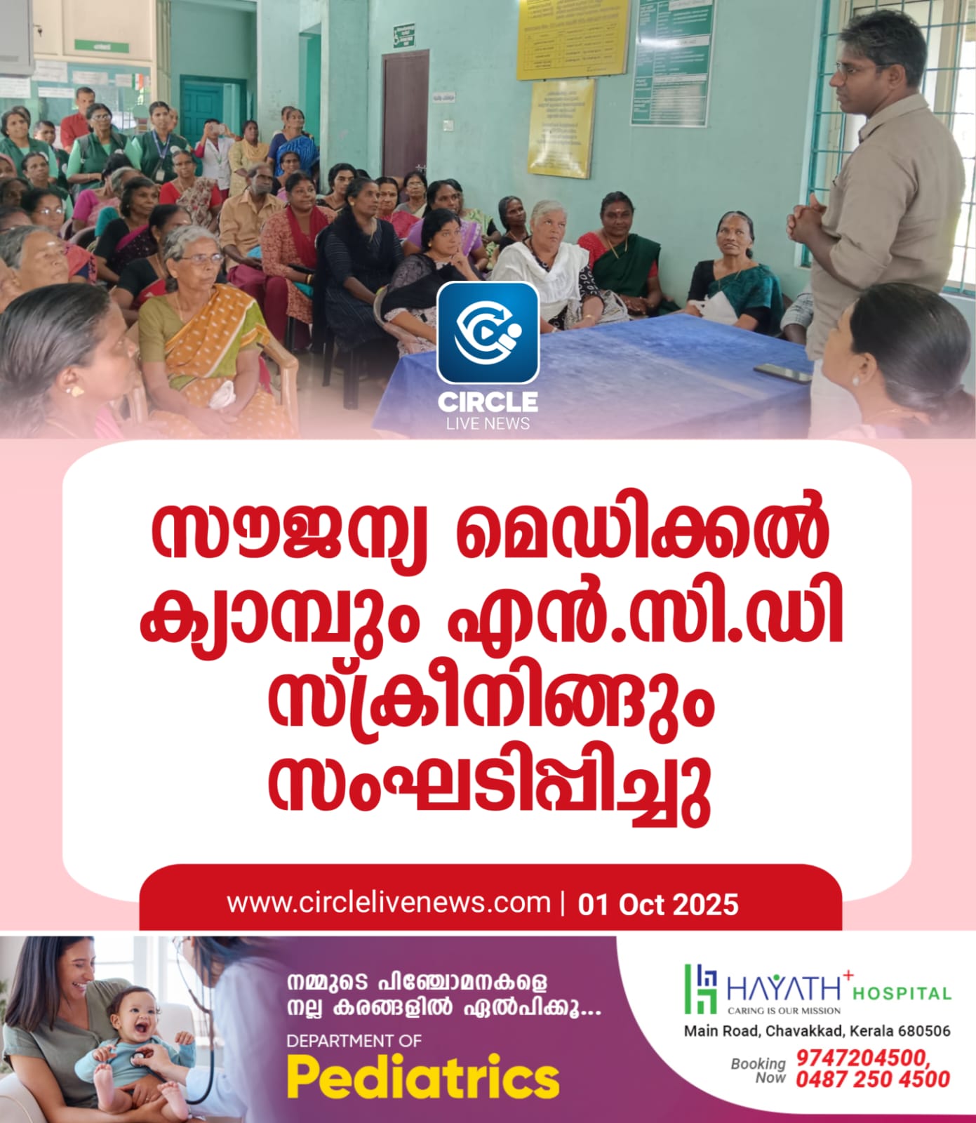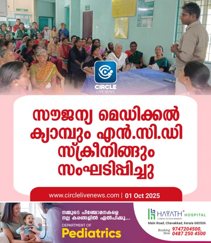 ഗുരുവായൂർ: ഗുരുവായൂർ നഗരസഭയും തൈക്കാട് ഗവ. ആയുർവേദ ഡിസ്പെൻസറിയും സംയുക്തമായി തൊഴിലുറപ്പ് തൊഴിലാളികൾക്കും ഹരിത കർമ്മ സേനാംഗങ്ങൾക്കുമായി സൗജന്യ മെഡിക്കൽ ക്യാമ്പും എൻ.സി.ഡി. സ്ക്രീനിങ്ങും നടത്തി. ഗുരുവായൂർ നഗരസഭ വികസന സ്റ്റാൻഡിങ് കമ്മിറ്റി ചെയർമാൻ എ.എഷഫീർ ഉദ്ഘാടനം ചെയ്തു. സീനിയർ മെഡിക്കൽ ഓഫീസർ ഡോ.ഷാർലറ്റ് വിൻസെന്റ് സ്വാഗതവും ഫാർമസിസ്റ്റ് വിശാഖ് ലാൽ നന്ദിയും പറഞ്ഞു. ‘ആയുർവേദം മാനവരാശിക്കും ഭൂമിക്കും’ എന്നതിന്റെ പ്രാധാന്യത്തെക്കുറിച്ചും ഭാരതീയ ചികിത്സ വകുപ്പിൽ നടത്തുന്ന വിവിധങ്ങളായ പ്രോജക്ടുകളെക്കുറിച്ചും സീനിയർ മെഡിക്കൽ ഓഫീസർ ഡോ. ഷാർലറ്റ് വിൻസെന്റ് വിശദീകരിച്ചു.