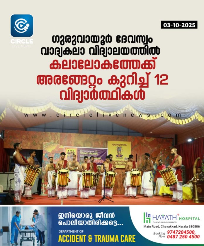 ഗുരുവായൂർ: ദേവസ്വം വാദ്യകലാ വിദ്യാലയത്തിൽ പഠനം പൂർത്തിയാക്കിയ വിദ്യാർത്ഥികളുടെ അരങ്ങേറ്റം ശ്രദ്ധേയമായി. 12 വിദ്യാർത്ഥികളാണ് കലാലോകത്തേക്ക് അരങ്ങേറ്റം കുറിച്ചത്. ചെണ്ട വിഭാഗത്തിൽ നിന്നും നാലു പേരും മദ്ദളം – മൂന്ന്, കൊമ്പ് – നാല്, അഷ്ടപദിയിൽ നിന്ന് ഒരു വിദ്യാർത്ഥിയും അരങ്ങേറ്റം കുറിച്ചു. കൂടാതെ മദ്ദളകേളി, കൊമ്പ് പറ്റ്, തായമ്പക, പഞ്ചവാദ്യം, മേളം, അഷ്ടപദി എന്നീ വാദ്യകലാ പരിപാടികളും വിദ്യാർത്ഥികൾ നടത്തി. ശ്രീഗുരുവായൂരപ്പൻ ഓഡിറ്റോറിയത്തിൽ നടന്ന ചടങ്ങിന് ക്ഷേത്രം തന്ത്രി ബ്രഹ്മശ്രീ.പി.സി ദിനേശൻ നമ്പൂതിരിപ്പാട് ഭദ്രദീപം തെളിച്ചു. ദേവസ്വം ചെയർമാൻ ഡോ.വി.കെ വിജയൻ ഉദ്ഘാടനം നിർവ്വഹിച്ചു. ദേവസ്വം ഭരണസമിതി അംഗം മനോജ് ബി നായർ സംസാരിച്ചു. ഡോ. പി.നാരായണൻ നമ്പൂതിരി വിദ്യാർത്ഥികൾക്ക് ഉപഹാരം നൽകി. വാദ്യകലാ വിദ്യാലയം പ്രിൻസിപ്പാൾ ടി.വി ശിവദാസിൻ്റെ നേതൃത്വത്തിൽ അധ്യാപകർ പരിപാടികൾക്ക് നേതൃത്വം നൽകി.
