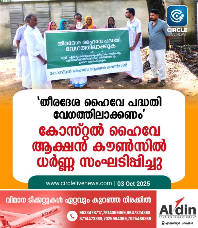 പുന്നയൂർ: തീരദേശ ഹൈവേ പദ്ധതി വേഗത്തിലാക്കണമെന്നാവശ്യപ്പെട്ട് ധർണ്ണ സംഘടിപ്പിച്ചു. പുന്നയൂർ, പുന്നയൂർക്കുളം പഞ്ചായത്തിലെ കോസ്റ്റൽ ഹൈവേ ആക്ഷൻ കൗൺസിലാണ് ധർണ സംഘടിപ്പിച്ചത്. തീരദേശ സംരക്ഷണ സമിതി സെക്രട്ടറി വി.കെ അഷ്റഫ് ഉദ്ഘാടനം ചെയ്തു. റിട്ട. വി.ഒ ടി.കെ പ്രവീൺ, സെക്കീർ, മൊയ്ദീൻ കുഞ്ഞി, മൊയ്ദീൻ തുടങ്ങിയവർ പങ്കെടുത്തു.
