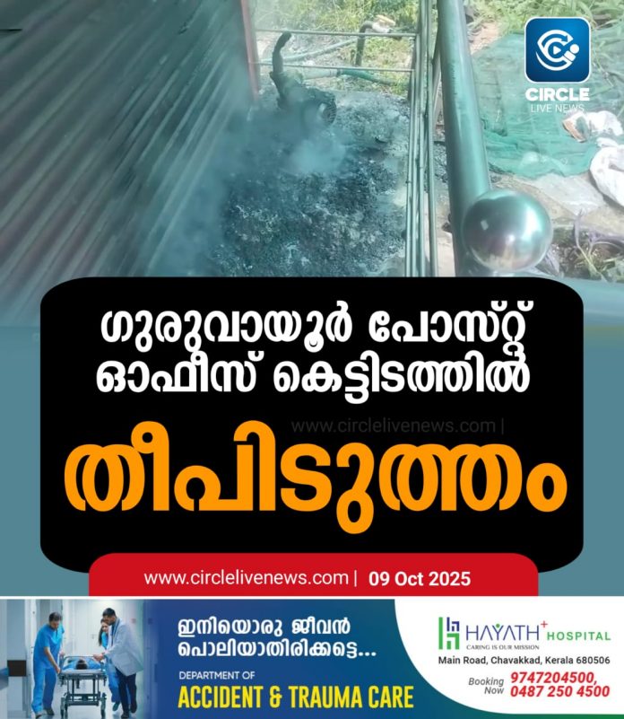 ഗുരുവായൂർ:ഗുരുവായൂർ പോസ്റ്റ് ഓഫീസ് കെട്ടിടത്തിൽ തീപിടുത്തം. ഗുരുവായൂർ കിഴക്കേ നടയിൽ നവീകരണം നടന്നുകൊണ്ടിരിക്കുന്ന കെട്ടിടത്തിലാണ് തീപിടുത്തമുണ്ടായത്. കെട്ടിടത്തിനോട് ചേർന്ന് കൂട്ടിയിട്ടിരുന്ന മാലിന്യങ്ങൾ ക്ക് തീ പിടിക്കുകയായിരുന്നു. തീ ആളി പടർന്നതോടെ വിവരം ഫയർഫോഴ്സിനെ അറിയിച്ചു. ഫയർഫോഴ്സ് സംഘം സ്ഥലത്തെത്തി തീ അണച്ചു. കെട്ടിടത്തിലെ മോട്ടോർ പമ്പ് സെറ്റിലെ ഷോർട്ട് സർക്യൂട്ടാണ് തീപിടുത്തത്തിന് കാരണമെന്നാണ് പ്രാഥമിക നിഗമനം. കെട്ടിടത്തിന്റെ നവീകരണം നടക്കുന്നതിനാൽ പോസ്റ്റ് ഓഫീസ് ഇപ്പോൾ പഴയ ബി.എസ്.എൻ.എൽ ഓഫീസിലാണ് പ്രവർത്തിക്കുന്നത്.