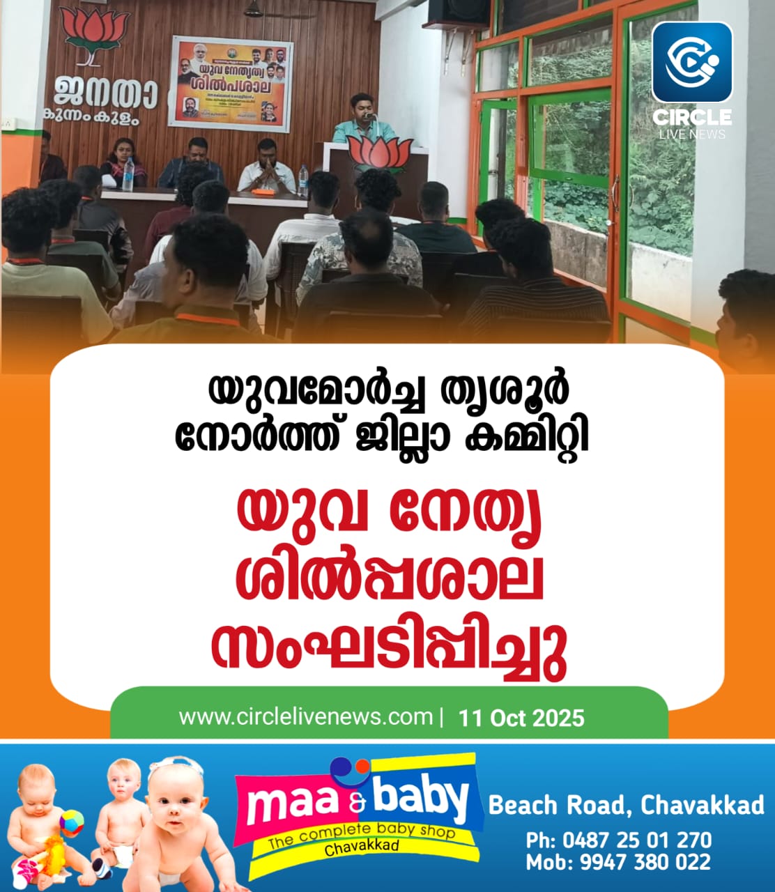 കുന്നംകുളം: യുവമോർച്ച തൃശൂർ നോർത്ത് ജില്ല കമ്മിറ്റിയുടെ നേതൃത്വത്തിൽ യുവ നേതൃ ശില്പശാല സംഘടിപ്പിച്ചു. ബി.ജെ.പി ജില്ല ജനറൽ സെക്രട്ടറി വിപിൻ കൂടിയേടത്ത് ഉദ്ഘാടനം ചെയ്തു. യുവമോർച്ച ജില്ല പ്രസിഡന്റ് കെ കാളിദാസൻ അധ്യക്ഷത വഹിച്ചു.സംസ്ഥാന സെക്രട്ടറി അദീന വിവിധ വിഷയങ്ങളെക്കുറിച്ച് ക്ലാസെടുത്തു. യുവമോർച്ച ജില്ല ജനറൽ സെക്രട്ടറി യദു സ്വാഗതവും യുവമോർച്ച കുന്നംകുളം മണ്ഡലം പ്രസിഡണ്ട് ശരത് ആലിക്കൽ നന്ദിയും പറഞ്ഞു. യുവമോർച്ച ജില്ല ജനറൽ സെക്രട്ടറി സുമിത്, ജില്ല മണ്ഡലം ഭാരവാഹികളും യൂത്ത് ഔട്ട്റീച്ച് ചുമതല വഹിക്കുന്നവരും പങ്കെടുത്തു.