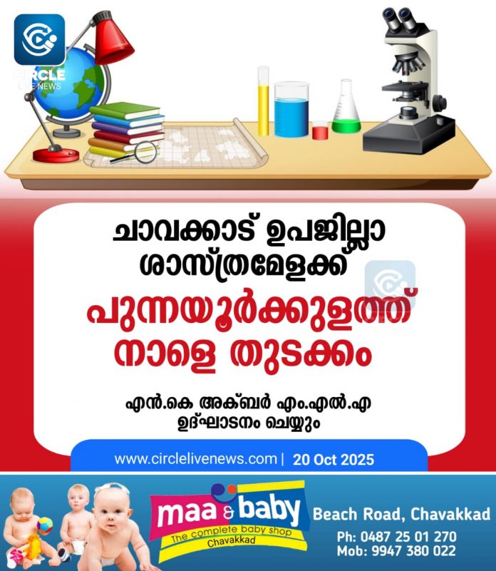 പുന്നയൂർക്കുളം: 2025-26 അധ്യയന വർഷത്തെ ചാവക്കാട് ഉപജില്ലാ ശാസ്ത്ര മേള ഒക്ടോബർ 21, 22 തിയതികളിൽ കടിക്കാട് ഗവ ഹയർ സെക്കൻ്ററി സ്കൂൾ, പുന്നയൂർക്കുളം ആർ.ആർ.എം.യു പി സ്കൂൾ എന്നിവടങ്ങളിൽ നടക്കും. മേളയുടെ ഉദ്ഘാടനം 21ന് രാവിലെ 10 മണിക്ക് എൻ.കെ അക്ബർ എം.എൽ.എ നിർവ്വഹിക്കും. സമാപന സമ്മേളനം 22 ന് വൈകിട്ട് 4 മണിക്ക് മുരളി പെരുനെല്ലി എം.എൽ.എ ഉദ്ഘാടനം ചെയ്യും. ജില്ല പഞ്ചായത്ത് വിദ്യാഭ്യാസ സ്റ്റാൻ്റിം കമ്മിറ്റി ചെയർമാൻ റഹീം വീട്ടിപ്പറമ്പിൽ , പുന്നയൂർക്കുളം ഗ്രാമ പഞ്ചായത്ത് പ്രസിഡൻ്റ് ജാസ്മിൻ ഷഹീർ, ഗുരുവായൂർ നഗരസഭാ ചെയർമാൻ എം കൃഷ്ണദാസ് തുടങ്ങിയവർ പങ്കെടുക്കും. സബ് ജില്ലയിലെ 96 സ്കൂളുകളിൽ നിന്നുള്ള 3350 ഓളം വിദ്യാർത്ഥികൾ മേളയിൽ പങ്കെടുക്കും. സയൻസ് സോഷ്യൽ സയൻസ് മേളകൾക്ക് പുന്നയൂർക്കുളം രാമരാജ മെമ്മോറിയൽ യു.പി സ്കൂൾ വേദിയാകും. പ്രവൃത്തിപരിചയ മേളയും ഐ.ടി ഗണിതശാസ്ത്രമേളകളും കടിക്കാട് ഗവ. ഹയർ സെക്കണ്ടറി സ്കൂളിൽ നടക്കും.