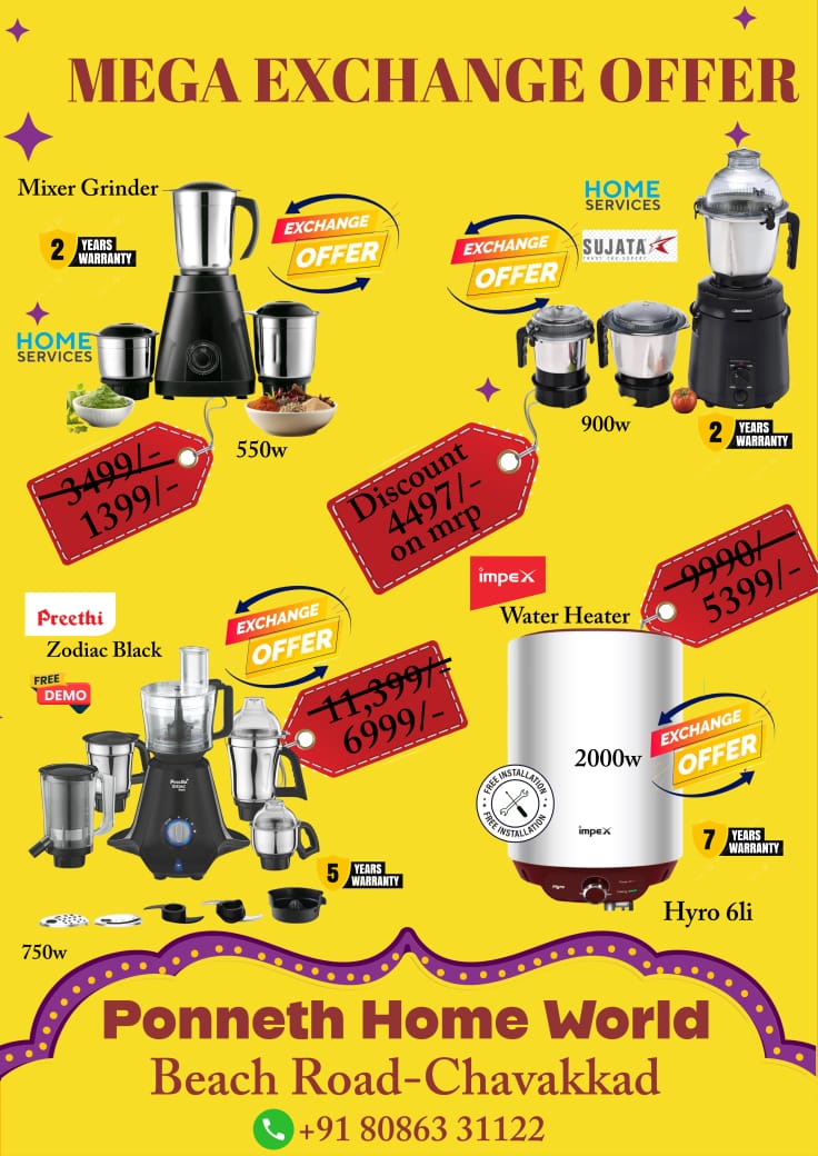 ബ്രാൻ്റഡ് കമ്പനികളുടെ വിവിധ മോഡലുകളിലുള്ള മിക്സികൾ എക്സ്ചേഞ്ചിലൂടെ വൻ വിലക്കുറവിൽ സ്വന്തമാക്കാം