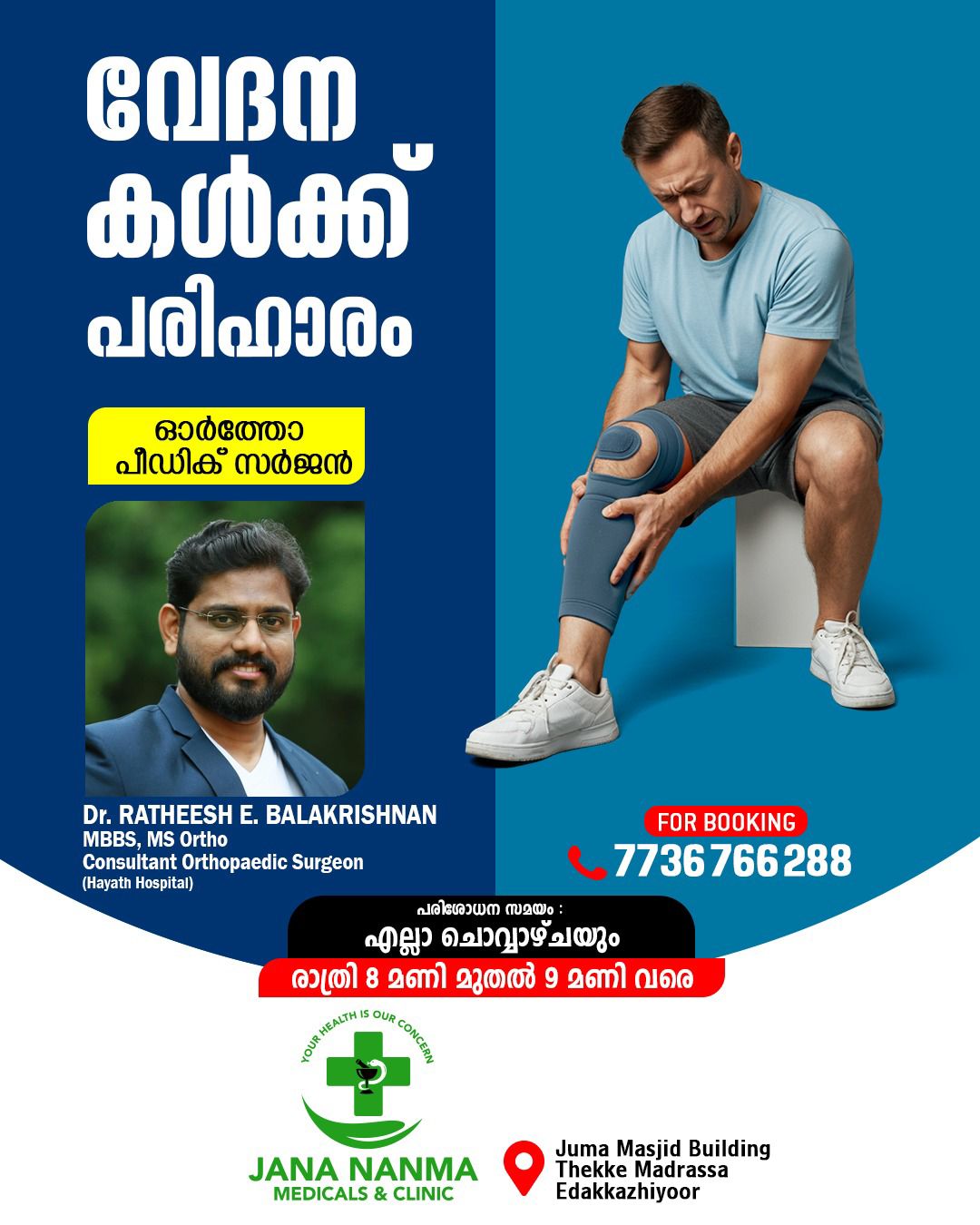 *പ്രശസ്ത ഓർത്തോപീഡിക് സർജൻ ഡോ. രതീഷ് ഇ ബാലകൃഷ്ണൻ്റെ സേവനം എല്ലാ ചൊവ്വാഴ്ചകളിലും രാത്രി 8 മണി മുതൽ 9 മണി വരെ ലഭ്യമാണ്*