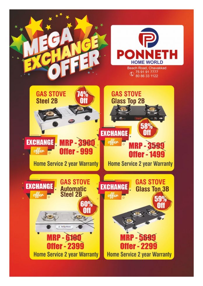 ബ്രാൻ്റഡ് കമ്പനികളുടെ വിവിധ മോഡലുകളിലുള്ള ഗ്യാസ് സ്റ്റൗകൾ എക്സ്ചേഞ്ചിലൂടെ വൻ വിലക്കുറവിൽ സ്വന്തമാക്കാം