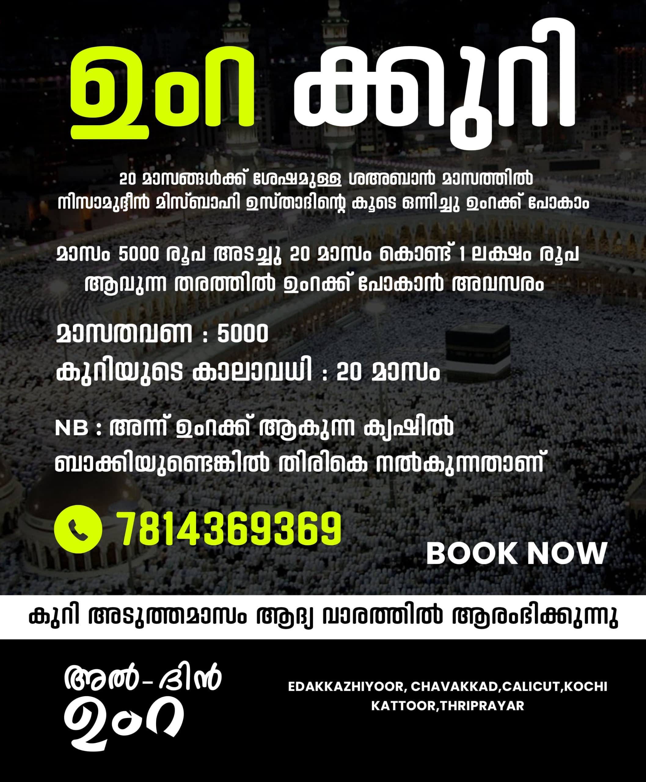 *മാസം വെറും ₹5000 മാത്രം നൽകി 20 മാസം കൊണ്ട് ആത്മീയതയുടെ മുത്തമിടുന്ന ഉംറാ യാത്രയുടെ ഭാഗമാകൂ.*