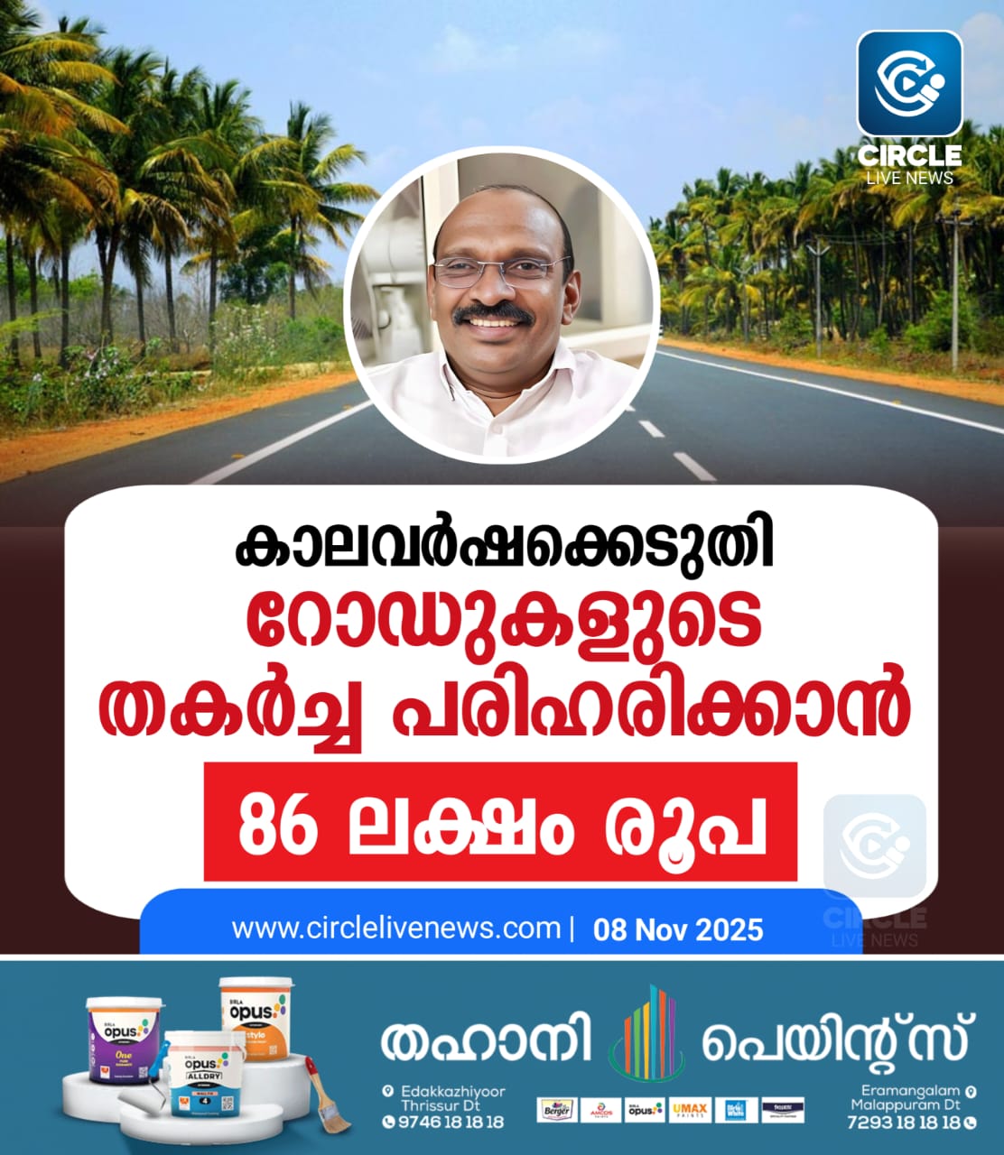 കാലവര്‍ഷക്കെടുതി; റോഡുകളുടെ തകർച്ച പരിഹരിക്കാൻ 86 ലക്ഷം രൂപ അനുവദിച്ചു