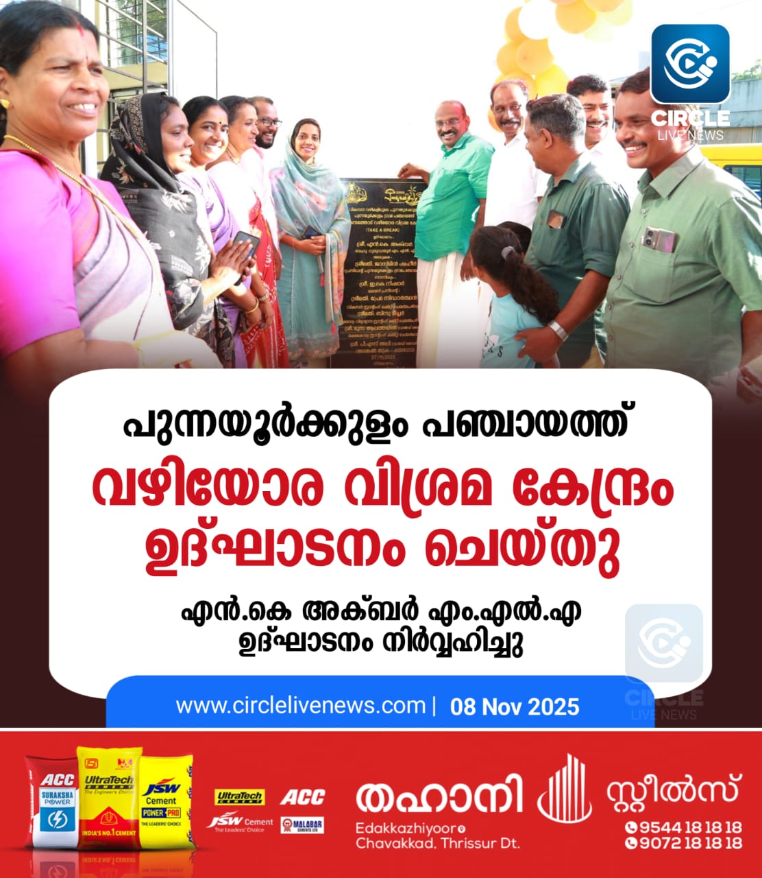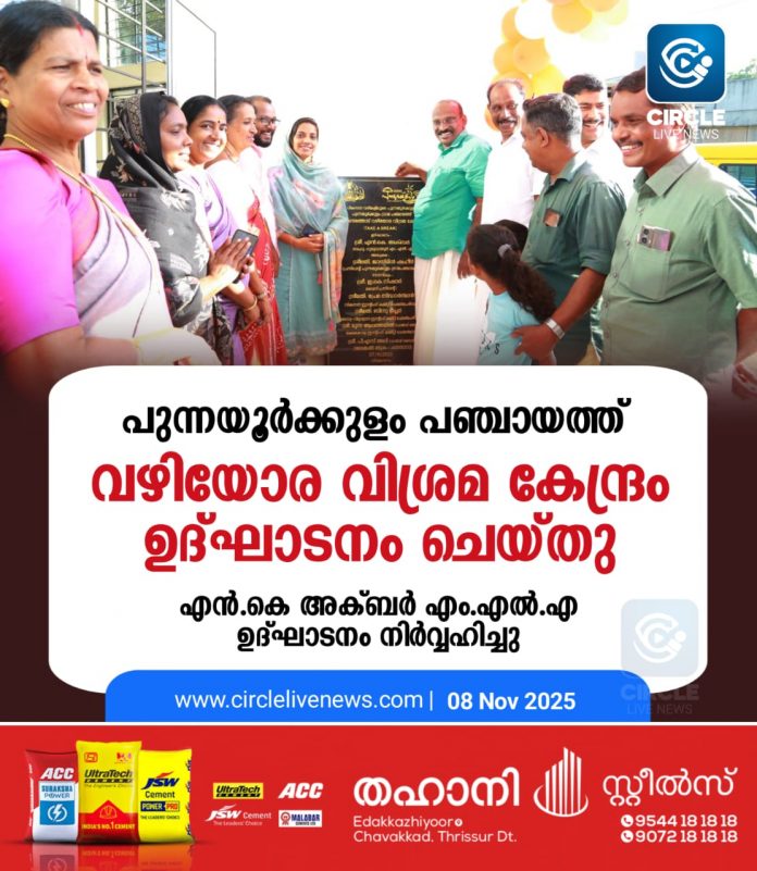പുന്നയൂർക്കുളം: പുന്നയൂർക്കുളം ഗ്രാമപഞ്ചായത്ത് വഴിയോരവിശ്രമ കേന്ദ്രം എൻ.കെ അക്ബർ എം.എൽ.എ ഉദ്ഘാടനം ചെയ്തു. പുന്നയൂർക്കുളം ഗ്രാമപഞ്ചായത്ത് പ്രസിഡണ്ട് ജാസ്മിൻ ഷഹീർ അധ്യക്ഷത വഹിച്ചു. പഞ്ചായത്ത് വൈസ് പ്രസിഡന്റ് ഇ.കെ നിഷാർ സ്വാഗതം പറഞ്ഞു. ബ്ലോക്ക് ആരോഗ്യ വിദ്യാഭ്യാസ സ്റ്റാന്റിംഗ് കമ്മിറ്റി ചെയർപേഴ്സൺ ഗ്രീഷ്മ ഷനോജ്, പഞ്ചായത്ത് സ്ഥിരം സമിതി അധ്യക്ഷൻമാരായ പ്രേമാ സിദ്ധാർത്ഥൻ,ബിന്ദു ടീച്ചർ, പഞ്ചായത്ത് മെമ്പർമാരായ പി.എസ് അലി, ശോഭ പ്രേമൻ, ബുഷറ നൗഷാദ്, ഹാജറ കമറുദ്ധീൻ, ബ്ലോക്ക് മെമ്പർ ബിജു പള്ളിക്കര തുടങ്ങിയവർ സംസാരിച്ചു. സ്റ്റേറ്റ് നിർമ്മിതി കേന്ദ്രക്കായിരുന്നു നിർമ്മാണചുമതല, ആഗ്ലോമറേഷൻ ഫണ്ടും പഞ്ചായത്ത് ഫണ്ടും കൂടി 40 ലക്ഷം രൂപ ചിലവിലാണ് നിർമ്മാണം പൂർത്തീകരിച്ചത്.