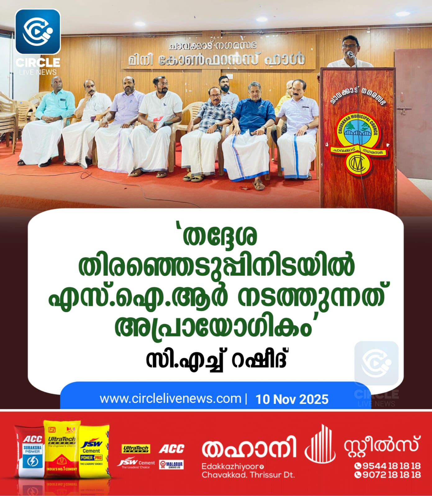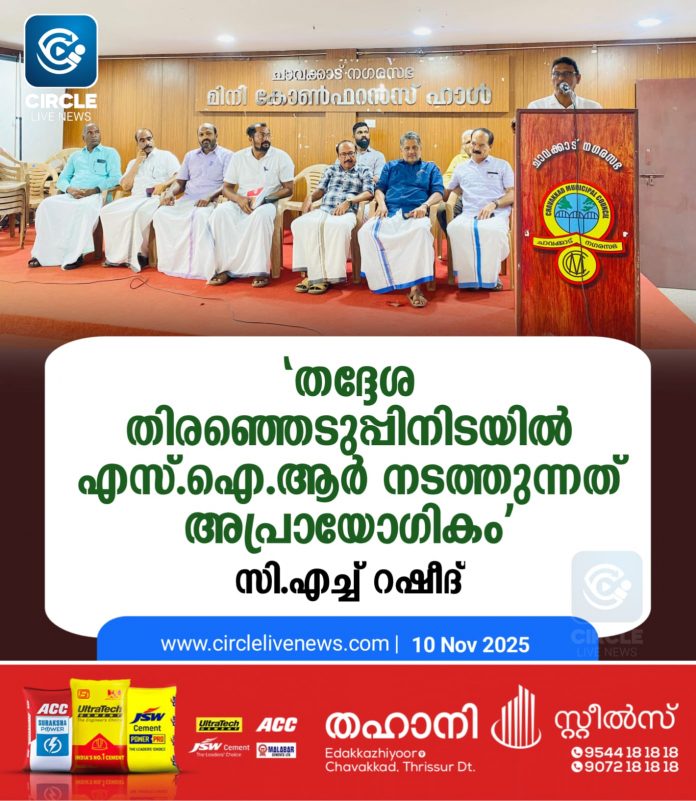 ചാവക്കാട്: തദ്ദേശ തിരഞ്ഞെടുപ്പിനിടയിൽ എസ്. ഐ.ആർ നടത്തുന്നത് അപ്രായോഗികമായിരിക്കുമെന്ന് മുസ്‌ലിം സംസ്ഥാന വൈസ് പ്രസിഡന്റ് സി.എച്ച് റഷീദ്. മുസ്‌ലിം ലീഗ് ചാവക്കാട് മുനിസിപ്പൽ തിരഞ്ഞെടുപ്പ് കൺവെൻഷൻ ഉദ്ഘാടനം ചെയ്ത് സംസാരിക്കുകയായായിരുന്നു അദ്ദേഹം. ബിഹാറിലെ സമീപകാല വോട്ടർ പട്ടിക പരിഷ്കരണത്തിലൂടെ വലിയൊരു വിഭാഗം വോട്ടർമാരെയാണ് പട്ടികയിൽ നിന്നും പൗരത്വത്തിൽ നിന്നും ഒഴിവാക്കിയിട്ടുള്ളത്. സ്വതന്ത്രവും നീതിയുക്തവുമായ തിരഞ്ഞെടുപ്പുകളെ തടസ്സപ്പെടുത്താനുള്ള “ബിജെപി യുടെ തന്ത്രമാണ്” സ്പെഷ്യൽ ഇന്റൻസീവ് റിവിഷൻ. സംസ്ഥാനത്തെ തദ്ദേശ തിരഞ്ഞെടുപ്പിന്റെ തിരക്കിനിടയിൽ  വോട്ടർ പട്ടിക പരിഷ്കരണം പൂർത്തിയാക്കണമെന്നുള്ള പിടിവാശിയിൽ നിന്ന് തെരഞ്ഞെടുപ്പ് കമ്മീഷൻ പിന്മാറണമെന്നും സി.എച്ച് റഷീദ് പറഞ്ഞു. മുസ്‌ലിം ലീഗ് മുനിസിപ്പൽ പ്രസിഡന്റ്‌ ഫൈസൽ കാനാംപുള്ളി അധ്യക്ഷത വഹിച്ചു. ജില്ല ട്രഷറർ ആർ.വി അബ്ദുറഹീം, ജില്ല വൈസ് പ്രസിഡന്റ് ഹാറൂൺ റഷീദ്, നിയോജക മണ്ഡലം പ്രസിഡന്റ്‌ ആർ.പി ബഷീർ, ട്രഷറർ ലത്തീഫ് പാലയൂർ, കെ.എം.സി.സി നേതാക്കളായ കെ.കെ മുഹമ്മദ്‌, അബ്ദു റസാക്, എം.എസ്.എഫ് ജില്ല പ്രസിഡന്റ്‌ ആരിഫ് പാലയൂർ, പ്രവാസി ലീഗ് മണ്ഡലം സെക്രട്ടറി മുഹമ്മദ്‌ അഷറഫ്, നേതാക്കളായ കുഞ്ഞീൻ ഹാജി, അബ്ദുൾ സത്താർ, എൻ.കെ റഹീം, ഇക്ബാൽ കാളിയത്ത്, പി.പി ഷാഹു, എം. എസ് മുസ്തഫ, ഹാഷിം ബ്ലാങ്ങാട്, മജീദ് ചാവക്കാട്, പി.എച്ച് മൊയ്‌ദീൻ, നജീബ് വലിയകത്ത്, അലി മണത്തല, കെ.എം റിയാസ്, ഹാഷിം മാലിക്, സാമ്പാഹ്‌ താഴത്ത്, ദാവുദുൽ ഹക്കീം, സിയാൻ മാളിയേക്കൽ തുടങ്ങിയവർ സംസാരിച്ചു. മുനിസിപ്പൽ ജനറൽ സെക്രട്ടറി പി.എം അനസ് സ്വാഗതവും ഫസൽ കരീം നന്ദിയും പറഞ്ഞു.