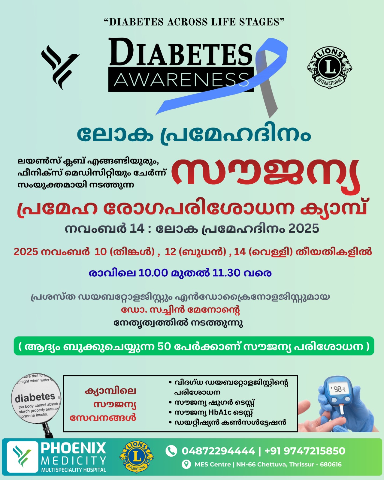 ▪️ ലോക പ്രമേഹദിനത്തിൻ്റെ ഭാഗമായി, ലയൺസ് ക്ലബ് ഏങ്ങണ്ടിയൂരും ചേറ്റുവ ഫീനിക്സ് മെഡിസിറ്റിയും ചേർന്ന് സംയുക്തമായി നടത്തുന്ന സൗജന്യ പ്രമേഹ പരിശോധന ക്യാമ്പ് നവംബർ 10,12,14 (തിങ്കൾ, ബുധൻ, വെള്ളി ) ദിവസങ്ങളിൽ രാവിലെ 10 മുതൽ 11.30 വരെ പ്രശസ്ത ഡയബറ്റോളജിസ്റ്റും എൻഡോക്രൈനോളജിസ്റ്റുമായ ഡോ. സച്ചിൻ മേനോൻ്റെ നേതൃത്വത്തിൽ നടത്തുന്നു