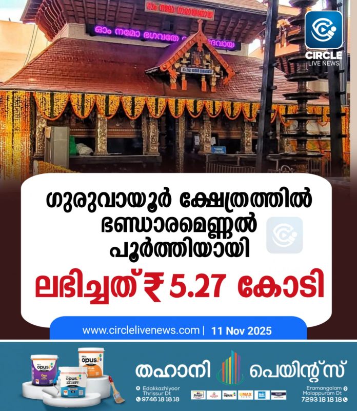 ഗുരുവായൂർ ക്ഷേത്രത്തിൽ ഭണ്ഡാരമെണ്ണൽ പൂർത്തിയായി; ലഭിച്ചത് 5.27 കോടി രൂപ