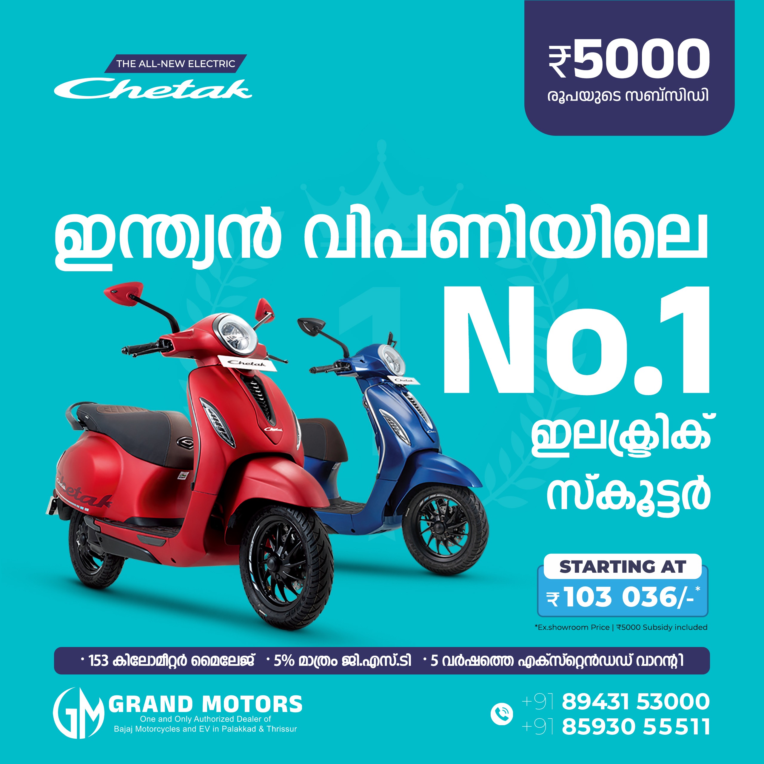 ബജാജിന്റെ ചേതക് ഇലക്ട്രിക് സ്കൂട്ടറുകൾ ഇപ്പോൾ ഗ്രാൻഡ് ബജാജിന്റെ പാലക്കാട് & തൃശ്ശൂർ ഷോറൂമുകളിൽ ലഭ്യമാണ്.