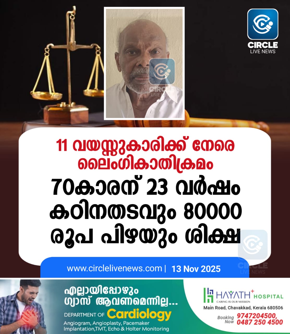 ചാവക്കാട്: 11 വയസ്സുകാരിക്ക് നേരെ ലൈംഗികാതിക്രമം നടത്തിയ 70കാരന് 23 വർഷം കഠിനതടവും 80000 രൂപ പിഴയും ശിക്ഷ. ചാവക്കാട് തിരുവത്ര ഇ.എം.എസ് നഗർ റമളാൻ വീട്ടിൽ മൊയ്തുവിനെയാണ് ചാവക്കാട് അതിവേഗ സ്പെഷ്യൽ കോടതി ജഡ്ജി എസ് ലിഷ കുറ്റക്കാരനാണെന്ന് കണ്ടെത്തി ശിക്ഷിച്ചത്. പിഴ അടക്കാത്ത പക്ഷം ഒരു വർഷവും 4 മാസവും കൂടി അധിക തടവ് അനുഭവിക്കണം. 2021 മുതൽ 2023 വരെയുള്ള കാലയളവിലാണ് പ്രതി പല ദിവസങ്ങളിലായി പെൺകുട്ടിക്കെതിരെ ലൈംഗികാതിക്രമം കാട്ടിയത്. പ്രതിയുടെ മൊബൈലിൽ അശ്ലീല വീഡിയോകൾ കാണിച്ചു നൽകുകയും ഇക്കാര്യം ആരോടും പറയാതിരിക്കാൻ പാരിതോഷികമായിപണം നൽകുകയും ചെയ്തുവെന്നാണ് പ്രോസിക്യൂഷൻ കേസ്. പിഴ അടക്കാത്ത പക്ഷം ഒരു വർഷവും 4 മാസവും കൂടി അധിക തടവ് അനുഭവിക്കണം. ചാവക്കാട് പോലീസ് സ്റ്റേഷനിൽ വിവരം അറിഞ്ഞതിനെ തുടർന്ന് സി.പി.ഒ എ പ്രസീത കുട്ടിയുടെ മൊഴി രേഖപ്പെടുത്തി ഹാജരാക്കിയതിന്റെ അടിസ്ഥാനത്തിൽ എസ്.ഐ ബിബിൻ ബി നായർ എഫ്.ഐ.ആർ രജിസ്റ്റർ ചെയ്ത് കേസിന്റ അന്വേഷണം പൂർത്തിയാക്കി കോടതിയിൽ കുറ്റപത്രം സമർപ്പിച്ചു. പ്രോസിക്യൂഷനു വേണ്ടി 14 സാക്ഷികളെ വിസ്തരിക്കുകയും ശാസ്ത്രീയ തെളിവുകൾ അടക്കം നിരവധി രേഖകളും മുതലുകളും ഹാജരാക്കുകയും ചെയ്തു. പ്രോസിക്യൂഷനു വേണ്ടി സ്പെഷ്യൽ പബ്ലിക് പ്രോസിക്യൂട്ടർ അഡ്വ. സിജു മുട്ടത്ത്, അഡ്വ. സി നിഷ എന്നിവർ ഹാജരായി. സി.പി.ഒ മാരായ എം.ആർ സിന്ധു, പ എ പ്രസീത എന്നിവർ കോടതി നടപടികൾ ഏകോപിപ്പിക്കുന്നതിനായി പ്രോസിക്യൂഷനെ സഹായിച്ചു. പ്രതിയെ കോടതി മറ്റൊരു പോക്സോ കേസിൽ 37 വർഷം കഠിനതടവിനും 3 ലക്ഷത്തി 10,000 രൂപ പിഴ അടക്കുന്നതിനും ശിക്ഷിക്കുകയും പ്രതി ശിക്ഷ അനുഭവിച്ച് വരുന്നതുമാണ്. പ്രതിക്കെതിരെ കോടതിയിൽ തന്നെ നിലവിലുള്ള മറ്റു രണ്ട് പോക്സോ കേസുകളിലെ വിചാരണ നടപടികൾ അന്തിമ ഘട്ടത്തിലാണ്.