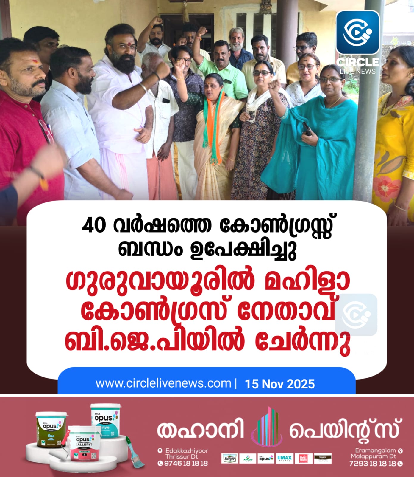 ഗുരുവായൂർ: 40 വർഷത്തെ കോൺഗ്രസ്സ് ബന്ധം ഉപേക്ഷിച്ച് ഗുരുവായൂരിൽ മഹിളാ കോൺഗ്രസ് നേതാവ് ബി.ജെ.പിയിൽ ചേർന്നു. മഹിളാ കോൺഗ്രസ്സ് ബ്ലോക്ക് ജനറൽ സെക്രട്ടറിയും വ്യവസായ കോൺഗ്രസ്സ് ജില്ലാ സെക്രട്ടറിയുമായ എം.വി രാജലക്ഷ്മിയാണ് ബി.ജെ.പിയിൽ അംഗത്വമെടുത്തത്. കോൺഗ്രസ്സിൻ്റെ സ്ത്രീ വിരുദ്ധ നിലപാടിൽ പ്രതിഷേധിച്ചാണ് താൻ കോൺഗ്രസ്സ് ഉപേക്ഷിക്കുന്നതെന്ന് എം.വിരാജലക്ഷ്മി പറഞ്ഞു. ബിജെപി ഗുരുവായൂർ മണ്ഡലം പ്രസിഡൻ്റ് അനിൽ മഞ്ചറമ്പത്ത് എം.വി രാജലക്ഷ്മിയെ ഷാൾ അണിയിച്ച് സ്വീകരിച്ചു. ശോഭാ ഹരിനാരായണൻ, ജ്യോതി രവീന്ദ്രനാഥ്, സുജയൻ മാമ്പുള്ളി, ദീപാ ബാബു, മനീഷ് കുളങ്ങര, പ്രസന്നൻ വലിയപറമ്പിൽ, ജിഷാദ് ശിവൻ, പ്രദീപ് പണിക്കശ്ശേരി, ദീപക് തിരുവെങ്കിടം, ഷിബീഷ് പാക്കത്ത്, മനോജ് പൊന്നുപറമ്പിൽ, സുധീഷ് പൊന്നരാശ്ശേരി, ജ്യോതി ബാസു എന്നിവർ പങ്കെടുത്തു.