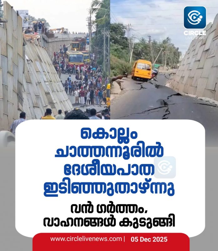 കൊല്ലം: ചാത്തന്നൂരിന് സമീപം ദേശീയപാത ഇടിഞ്ഞ് താഴ്ന്നു. ചാത്തന്നൂരിന് സമീപമുള്ള മൈലക്കാടാണ് സംഭവം. ദേശീയപാതയുടെ പാര്ശ്വഭിത്തി ആണ് ഇടിഞ്ഞത്. ഇതോടെ സര്വീസ് റോഡ് തകര്ന്നു. മൈലക്കാട് പാലത്തിന് സമീപത്തെ അപ്രോച്ച് റോഡില് വലിയ ഗര്ത്തം രൂപപ്പെടുകയും ചെയ്തു. ദേശീയപാത ഇടിഞ്ഞുവീണ സമയത്ത് സര്വീസ് റോഡില് സ്കൂള് വാനടക്കമുണ്ടായിരിന്നു. വാഹനത്തിലുണ്ടായിരുന്നവരെ സുരക്ഷിത സ്ഥാനത്തേക്ക് മാറ്റി.