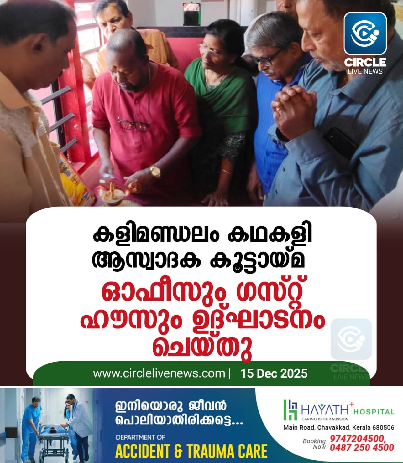 തൃപ്രയാർ: കളിമണ്ഡലം കഥകളി ആസ്വാദക കൂട്ടായ്മയുടെ 17-ാമത് വാർഷികാഘോഷത്തിനു മുന്നോടിയായി ഓഫീസും ഗസ്റ്റ് ഹൗസും ഉദ്ഘാടനം ചെയ്തു. സംഗീത സംവിധായകൻ വിദ്യാധരൻ മാസ്റ്റർ ഉദ്ഘാടനം നിർവ്വഹിച്ചു. 2025 ലെ ഗുരു നിത്യചൈതന്യയതി സാഹിത്യ പുരസ്ക്കാര സാക്ഷ്യപത്രത്തിനർഹയായ ബീനാ സദാനന്ദനെ ചടങ്ങിൽ വിദ്യാധരൻ മാസ്റ്റർ പൊന്നാടയണിച്ചു. കളിമണ്ഡലം ചെയർമാൻ സദു ഏങ്ങൂർ അധ്യക്ഷത വഹിച്ചു. സെക്രട്ടറി കെ ദിനേശ് രാജാ, ഭാരവാഹികളായ കിഷോർ കണാറ, കെ.ജി കൃഷ്ണകുമാർ, കെ.ആർ മധു, ശ്രീലാൽ കൊച്ചത്ത്, ശശികാന്ത്, അനിൽകുമാർ എന്നിവർ സംസാരിച്ചു.
