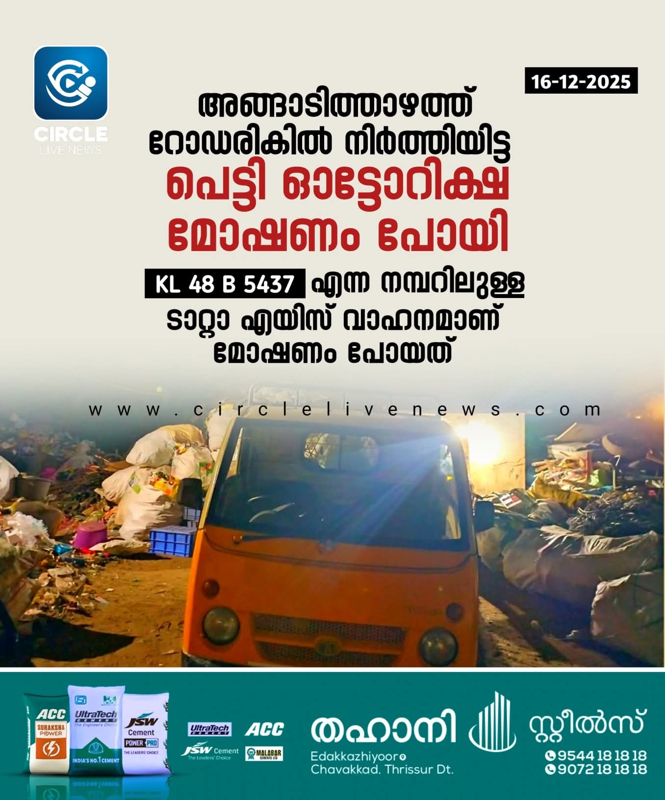 ചാവക്കാട്: റോഡരികിൽ നിർത്തിയിട്ട പെട്ടി ഓട്ടോറിക്ഷ മോഷണം പോയി. പട്ടാമ്പി കൊട്ടൂർക്കര വരമംഗലത്ത് വീട്ടിൽ മുഹമ്മദ് അനസിൻ്റെ ഉടമസ്ഥതയിലുള്ള KL 48 B 5437 എന്ന നമ്പറിലുള്ള ടാറ്റാ എയിസ് വാഹനമാണ് മോഷണം പോയത്. ഇന്ന് രാത്രി 7.30 ഓടെയായിരുന്നു സംഭവം. അങ്ങാടിത്താഴം നിസ്കാര പള്ളിക്കടുത്തെ പഴയ ഇരുമ്പ് വസ്തുക്കൾ വിൽപ്പന നടത്തുന്ന കടക്ക് മുന്നിൽ നിർത്തിയിട്ടതായിരുന്നു വാഹനം. ഇതേസമയം സ്ഥലത്തെത്തിയ ഒരാൾ വാഹനം ഓടിച്ചു പോവുകയായിരുന്നു. പഞ്ചാരമുക്ക് ഭാഗത്തേക്കാണ് വാഹനം പോയത്. ചാവക്കാട് പോലീസിൽ പരാതി നൽകിയിട്ടുണ്ട്. വാഹനത്തെ കുറിച്ച് വിവരം ലഭിക്കുന്നവർ തൊട്ടടുത്ത പോലീസ് സ്റ്റേഷനിൽ അറിയിക്കണം.