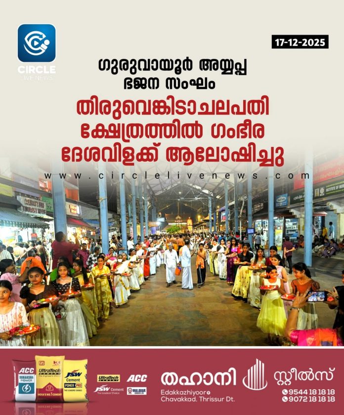 ഗുരുവായൂർ: ഗുരുവായൂർ അയ്യപ്പ ഭജന സംഘത്തിന്റെ ആഭിമുഖ്യത്തിൽ തിരുവെങ്കിടാചലപതി ക്ഷേത്രത്തിൽ ഗംഭീര ദേശവിളക്ക് ആലോഷിച്ചു. രാവിലെ ശബരിമലയിലേക്ക് കൊണ്ട് പോകുന്ന സത്യമുദ്ര സമർപ്പണം ഉണ്ടായി. തുടർന്ന് ഗുരുവായൂർ ജയപ്രകാശിന്റെ കേളി, മഹാഗണപതി ഹോമം, അഷ്ടപദി, ഉച്ചപ്പാട്ട് എഴുന്നെള്ളിപ്പ് എന്നിവ നടന്നു. ഉച്ചയ്ക്കും രാത്രിയും നടന്ന അന്നദാനത്തിൽ ആയിരക്കണക്കിന് ഭക്തർ പങ്കെടുത്തു. വൈകീട്ട് ഗുരുവായൂർ ക്ഷേത്രസന്നിധിയിൽ നിന്ന് ഗജവീരന്റെയും പഞ്ചവാദ്യത്തിന്റെയും ഉടുക്കുപാട്ടിന്റെയും താലങ്ങളുടെയും അകമ്പടിയോടെ പാലകൊമ്പ് എഴുന്നെള്ളിപ്പ് തിരുവെങ്കിടാചലപതി ക്ഷേത്രസന്നിധിയിലേക്ക് മേൽപ്പാലം വഴി എത്തി ചേർന്നു. ക്ഷേത്ര തിരുമുറ്റത്ത് ഗുരുവായൂർ ജോതിദാസും സംഘവും അവതരിപ്പിച്ച ഭക്തിഗാനസുധ അരങ്ങേറി. രാത്രിയിൽ പന്തലിൽപ്പാട്ട്, പാൽ കിണ്ടി എഴുന്നെള്ളിപ്പ്, ആഴിനൃത്തം, വെട്ടും തട തുടങ്ങി വിളക്ക് ചടങ്ങുകളുമുണ്ടായി. ഗുരുസ്വാമി മച്ചാട് സുബ്രമണ്യനും സംഘവുമാണ് വിളക്ക് പാർട്ടി. ജി.കെ പ്രകാശൻ, കെ. ദിവാകരൻ നമ്പ്യാർ, ചന്ദ്രൻ ചങ്കത്ത്, എം. രാധാകൃഷ്ണൻ, പ്രഭാകരൻ മണ്ണൂർ, രാജു ഇളയേടത്ത്, ബാലൻ വാറണാട്ട്, കെ.പി കരുണാകരൻ, ശിവൻ കണിച്ചാടത്ത്, ശശി അകമ്പടി, എം.പി ശങ്കരനാരായണൻ, രാമകൃഷ്ണൻ ഇളയത്, പി. ഹരി നാരായണൻ, ദിനു കോഴികുളങ്ങര, മോഹനചിത്ര എന്നിവർ നേതൃത്വം നൽകി.