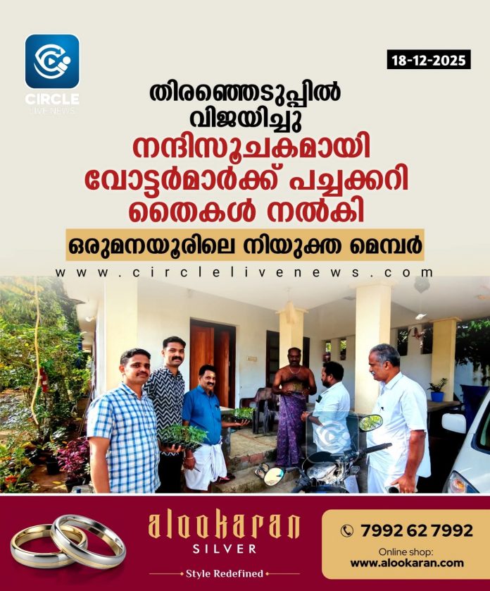ഒരുമനയൂർ: തിരഞ്ഞെടുപ്പിൽ വിജയിച്ചതിൻ്റെ നന്ദി അറിയിച്ച് വോട്ടർമാർക്ക് പച്ചക്കറി തൈകൾ നൽകി നിയുക്ത മെമ്പർ. ഒരുമനയൂർ പഞ്ചായത്ത് ആറാം വാർഡിൽ നിന്നും വിജയിച്ച സി.വി ധനേഷാണ് വാർഡിലെ മുഴുവൻ വോട്ടർമാർക്കും പച്ചക്കറികൾ നൽകി വേറിട്ട മാതൃക സൃഷ്ടിച്ചത്. നിയുക്ത ബ്ലോക്ക് മെമ്പർ കെ.ജെ ചാക്കോ, യു.ഡി.എഫ് നേതാക്കളായ ശ്യാം സുന്ദർ, ജോബി ആളൂർ, അശ്വിൻ ചാക്കോ, വിൽസൺ എന്നിവർ നേതൃത്വം നൽകി.