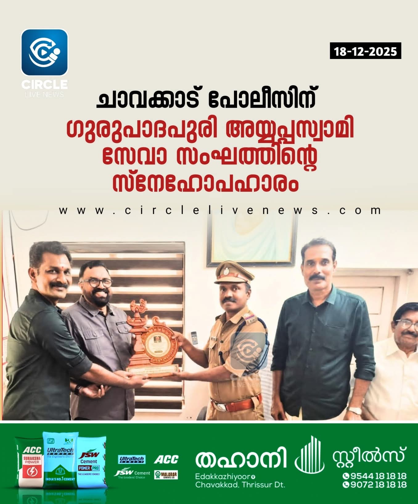 ചാവക്കാട്: ഗുരുപാദപുരി ശ്രീ അയ്യപ്പസ്വാമി സേവാ സംഘത്തിന്റെ ആഭിമുഖ്യത്തിൽ തത്വമസി ഗൾഫ് നടത്തിയ 20 -ാമത് ദേശവിളക്ക് മഹോത്സവം മികച്ച രീതിയിൽ നടത്തുന്നതിനു വേണ്ടിയുള്ള എല്ലാ സഹായ സഹകരണങ്ങളും നൽകിയ ചാവക്കാട് പോലീസിന് സ്നേഹോപഹാരം കൈമാറി. ചാവക്കാട് പോലീസ് സ്റ്റേഷനിൽ വച്ചു നടന്ന ചടങ്ങിൽ ഗുരുപാദപുരി അയ്യപ്പസ്വാമി സേവാ സംഘം ചെയർമാൻ ഡോ. പി.വി മധുസൂദനനും തത്വമസി ഗൾഫ് സ്ഥാപകൻ ബിനീഷ് രാജ് നെടിയേടത്തും ചേർന്ന് ചാവക്കാട് സ്റ്റേഷൻ ഹൗസ് ഓഫീസർ വി.വി വിമലിന് സ്നേഹോപഹാരം കൈമാറി. ചടങ്ങിൽ കൺവീനർ എൻ.വി മധു, എക്സിക്യൂട്ടീവ് കമ്മിറ്റി അംഗം എൻ.കെ സിദ്ധാർത്ഥൻ, പോലീസ് സേനാംഗങ്ങൾ തുടങ്ങിയവർ പങ്കെടുത്തു