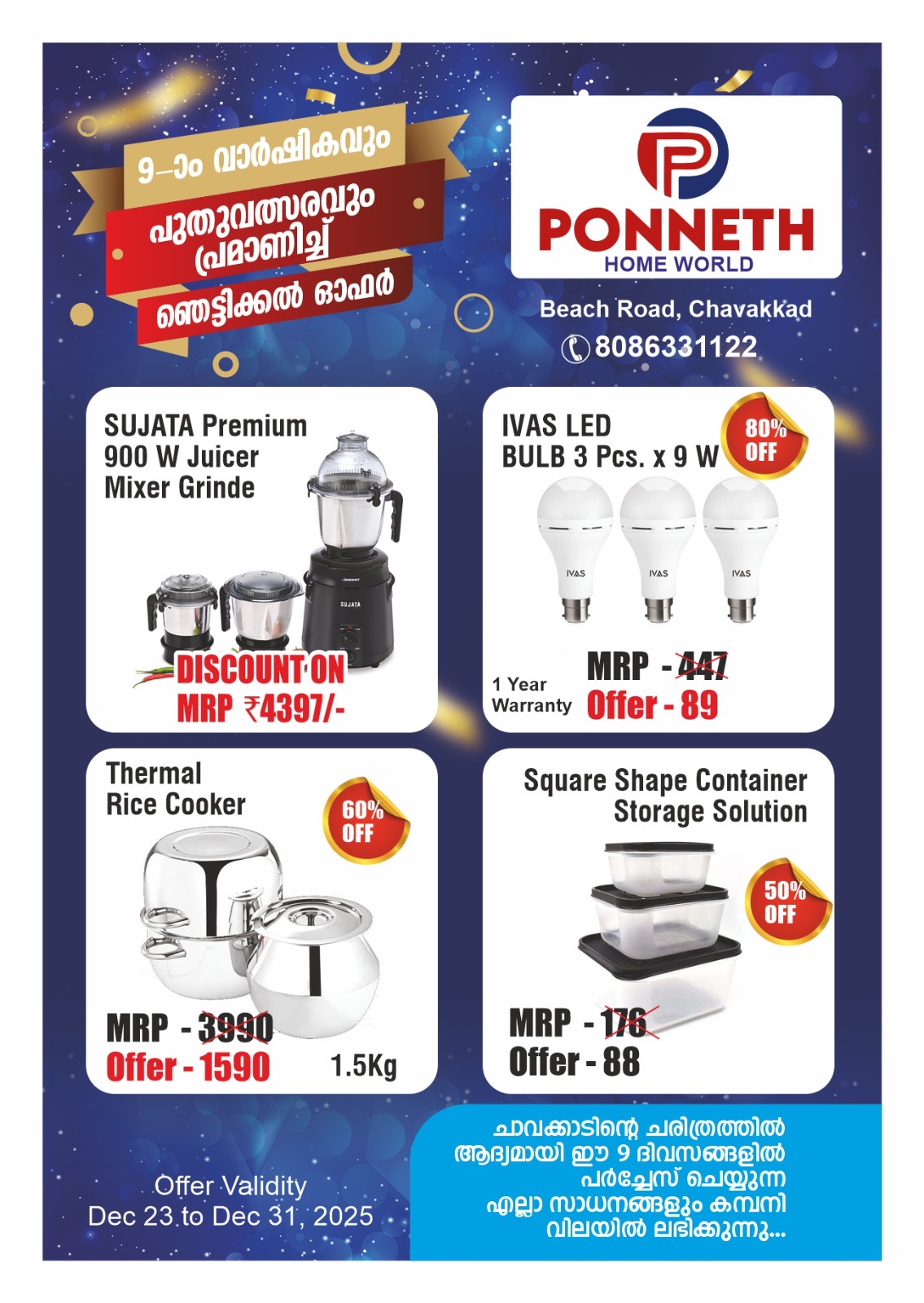 ആഘോഷങ്ങൾക്ക് മാറ്റുകൂട്ടാൻ ചാവക്കാട് ആദ്യമായി “ഞെട്ടിക്കുന്ന” ഓഫറുകളുമായി പൊന്നേത്ത് ഹോം വേൾഡ്…