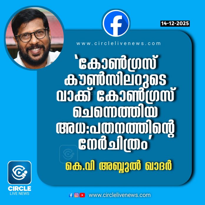 ചാവക്കാട്: കോൺഗ്രസ് ചെന്നെത്തിയ അധ:പതനത്തിന്റെ നേർചിത്രമാണ് തൃശൂർ കോർപ്പറേഷനിൽ കോൺഗ്രസ് കൗൺസിലറുടെ വാക്കുകളെന്ന് സിപിഎം തൃശ്ശൂർ ജില്ലാ സെക്രട്ടറി കെ.വി അബ്ദുൽ ഖാദർ. തൻറെ ഫേസ്ബുക്ക് പോസ്റ്റിലാണ് അബ്ദുൽ ഖാദർ അഭിപ്രായ പ്രകടനം നടത്തിയത്. തന്നോട് ഡി.സിസി പ്രസിഡണ്ട് കോഴ ചോദിച്ചുവെന്നും ഇവർ ആരോപിക്കുന്നു. വഞ്ചനയും കുതികാൽ വെട്ടും അഴിമതിയും കൊണ്ട് മുഖരിതമായ ഒരു പാർട്ടിയാണ് കോൺഗ്രസെന്നും എങ്ങിനെയാണ് ഇവരെ വിശ്വസിക്കുകയെന്നും അബ്ദുൽ ഖാദർ ചോദിക്കുന്നു.