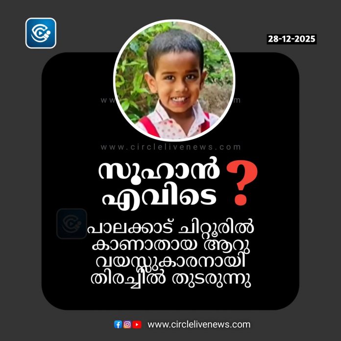 പാലക്കാട്: ചിറ്റൂരിൽ കാണാതായ ആറുവയസ്സുകാരനായി തിരച്ചിൽ തുടരുന്നു. ചിറ്റൂർ അമ്പാട്ടുപാളയം എരുമങ്കോട്ടുനിന്ന് കാണാതായ സുഹാന് വേണ്ടിയാണ് ഞായറാഴ്ച രാവിലെ തിരച്ചിൽ പുനഃരാരംഭിച്ചത്. അമ്പാട്ടുപാളയം എരുമങ്കോട് സ്വദേശികളായ മുഹമ്മദ് അനസിന്റെയും തൗഹിതയുടെയും മകനായ സുഹാനെ ശനിയാഴ്ച ഉച്ചയ്ക്ക് 12 മണിയോടെയാണ് കാണാതായത്. മുഹമ്മദ് അനസ് ഗൾഫിലാണ്. അധ്യാപികയായ അമ്മ തൗഹിത ഈസമയം പാലക്കാട്ട് പോയിരിക്കുകയായിരുന്നു.