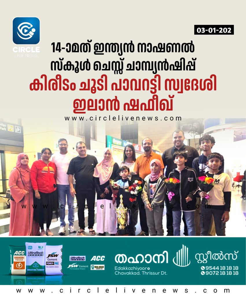 പാവറട്ടി: 14-ാമത് ഇന്ത്യൻ നാഷണൽ സ്കൂൾ ചെസ്സ് ചാമ്പ്യൻഷിപ്പ് കരസ്ഥമാക്കി പാവറട്ടി സ്വദേശിയായ ഇന്ത്യൻ സ്കൂൾ ബൗഷർ നാലാം ക്ലാസ്സ് വിദ്യാർത്ഥി ഇലാൻ ഷഫീഖ്. ആസാമിലെ ഗുഹാത്തിയിൽ 2025 ഡിസംബർ 27 മുതൽ 31 വരെ സറുസാജൈ ഇൻഡോർ സ്റ്റേഡിയത്തിൽ വച്ച് നടന്ന 14-ാമത് ഇന്ത്യൻ നാഷണൽ സ്കൂൾ ചെസ്സ് ചാമ്പ്യൻഷിപ്പിൽ അണ്ടർ 9 കാറ്റഗറിയിൽ ഒമ്പത് മത്സരങ്ങളിൽ ഏഴ് മത്സരങ്ങളിൽ വിജയിച്ചും വാശിയേറിയ രണ്ടു മത്സരങ്ങളിൽ സമനില പാലിച്ച് എട്ട് പോയിന്റുകൾ കരസ്ഥമാക്കിയാണ് ഇന്ത്യൻ സ്കൂൾ ബൗഷർ നാലാം ക്ലാസ്സ് വിദ്യാർത്ഥിയായ ഇലാൻ ഷഫീഖ് ചാമ്പ്യൻ പട്ടം കരസ്ഥമാക്കിയത്. ഇന്ത്യയിൽ നിന്നുമുള്ള 28 സംസ്ഥാനങ്ങളെ പ്രനിധീകരിച്ച് വിദ്യാര്തഥികൾ മത്സരത്തിൽ പങ്കെടുത്തിരുന്നു. ഒമാനിൽ നിന്നും ആദ്യമായാണ് ഒരു വിദ്യാർത്ഥി നാഷണൽ ചെസ്സ് ചാമ്പ്യൻഷിപ്പ് കരസ്ഥമാക്കുന്നത്. 14-ാമത് ഇന്ത്യൻ നാഷണൽ സ്കൂൾ ചെസ്സ് ചാമ്പ്യൻഷിപ്പ് ചാമ്പ്യൻ പട്ടം കരസ്ഥമാക്കി മസ്കറ്റ് എയർപോർട്ടിലെത്തിയ ഇലാൻ ഷഫീഖിനെ സ്കൂൾ അധ്യാപകരും കോച്ചുമാരും സുഹൃത്തുക്കളും കുടുംബാംഗങ്ങളും ചേർന്ന് വൻ സ്വീകരണമാണ് നൽകിയത്. ഇന്ത്യൻ സ്കൂൾ ബൗഷറിൻറെ പരിപൂർണ്ണ സഹകരണവും, അധ്യാപകരിൽ നിന്നുമുള്ള മികച്ച പിന്തുണയും പ്രത്യേഗിച്ച് സ്കൂൾ ചെസ്സ് കോച്ചും ചെസ്സ് മാസ്റ്റർ അക്കാഡമി കോച്ചുമായ ഈജിപ്തിൽ നിന്നുമുള്ള മെഗ്തിയുടെ തീവ്ര പരിശീലനവുമാണ് ഇലാൻ ഷഫീഖിന്റെ ഈ നേട്ടത്തിനു പിന്നിൽ. ഇലാൻ ഷഫീഖ് ഡിസംബർ ആദ്യവാരത്തിൽ ഒമാനിൽ വെച്ച് എട്ട് രാജ്യങ്ങളിൽ നിന്നുള്ള 54 കളിക്കാരുമായി നടന്ന ഫിഡെ റേറ്റഡ് ക്ലാസിക്കൽ ഓപ്പൺ ടൂർണമെന്റിൽ വിജയിച്ച് ഒമാന്റെ ചരിത്രത്തിലെ ഏറ്റവും പ്രായം കുറഞ്ഞ ക്ലാസിക്കൽ ഫിഡെ റേറ്റഡ് ചാമ്പ്യനായി. ഒട്ടനവധി നാഷണൽ, ഇന്റർനാഷണൽ മത്സരങ്ങളിൽ ഇലാൻ ഷഫീഖ് പങ്കെടുത്തിട്ടുണ്ട്. സഹോദരങ്ങളായ സിനാൻ ഷഫീഖ് (ഇന്ത്യൻ സ്കൂൾ സീബ്) ഇസാൻ ഷഫീഖ് (ഇന്ത്യൻ സ്കൂൾ ബൗഷർ) എന്നിവർ സി.ബി.എസ്.സി നേഷനാൽ സ്കൂൾ ബ്രൗൺസ് മെഡലിസ്റ്റുകളാണ്. ഇന്ത്യൻ സ്കൂൾ ബൗഷർ വിദ്യാർത്ഥിയായ ഇശൽ ഷഫീഖ് നല്ലൊരു കലാകാരികൂടിയാണ്. പാവറട്ടി വെന്മേനാട് ചക്കനാത്ത് ഷഫീഖ് -നഷീജാ ദമ്പതികളുടെ മക്കളാണ് ഇവർ