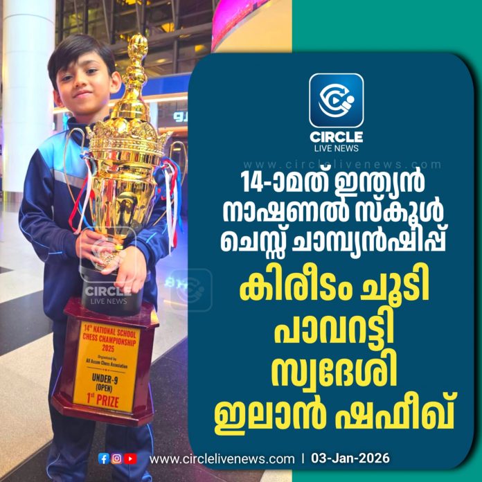 പാവറട്ടി: 14-ാമത് ഇന്ത്യൻ നാഷണൽ സ്കൂൾ ചെസ്സ് ചാമ്പ്യൻഷിപ്പ് കരസ്ഥമാക്കി പാവറട്ടി സ്വദേശിയായ ഇന്ത്യൻ സ്കൂൾ ബൗഷർ നാലാം ക്ലാസ്സ് വിദ്യാർത്ഥി ഇലാൻ ഷഫീഖ്. ആസാമിലെ ഗുഹാത്തിയിൽ 2025 ഡിസംബർ 27 മുതൽ 31 വരെ സറുസാജൈ ഇൻഡോർ സ്റ്റേഡിയത്തിൽ വച്ച് നടന്ന 14-ാമത് ഇന്ത്യൻ നാഷണൽ സ്കൂൾ ചെസ്സ് ചാമ്പ്യൻഷിപ്പിൽ അണ്ടർ 9 കാറ്റഗറിയിൽ ഒമ്പത് മത്സരങ്ങളിൽ ഏഴ് മത്സരങ്ങളിൽ വിജയിച്ചും വാശിയേറിയ രണ്ടു മത്സരങ്ങളിൽ സമനില പാലിച്ച് എട്ട് പോയിന്റുകൾ കരസ്ഥമാക്കിയാണ് ഇന്ത്യൻ സ്കൂൾ ബൗഷർ നാലാം ക്ലാസ്സ് വിദ്യാർത്ഥിയായ ഇലാൻ ഷഫീഖ് ചാമ്പ്യൻ പട്ടം കരസ്ഥമാക്കിയത്. ഇന്ത്യയിൽ നിന്നുമുള്ള 28 സംസ്ഥാനങ്ങളെ പ്രനിധീകരിച്ച് വിദ്യാര്തഥികൾ മത്സരത്തിൽ പങ്കെടുത്തിരുന്നു. ഒമാനിൽ നിന്നും ആദ്യമായാണ് ഒരു വിദ്യാർത്ഥി നാഷണൽ ചെസ്സ് ചാമ്പ്യൻഷിപ്പ് കരസ്ഥമാക്കുന്നത്. 14-ാമത് ഇന്ത്യൻ നാഷണൽ സ്കൂൾ ചെസ്സ് ചാമ്പ്യൻഷിപ്പ് ചാമ്പ്യൻ പട്ടം കരസ്ഥമാക്കി മസ്കറ്റ് എയർപോർട്ടിലെത്തിയ ഇലാൻ ഷഫീഖിനെ സ്കൂൾ അധ്യാപകരും കോച്ചുമാരും സുഹൃത്തുക്കളും കുടുംബാംഗങ്ങളും ചേർന്ന് വൻ സ്വീകരണമാണ് നൽകിയത്. ഇന്ത്യൻ സ്കൂൾ ബൗഷറിൻറെ പരിപൂർണ്ണ സഹകരണവും, അധ്യാപകരിൽ നിന്നുമുള്ള മികച്ച പിന്തുണയും പ്രത്യേഗിച്ച് സ്കൂൾ ചെസ്സ് കോച്ചും ചെസ്സ് മാസ്റ്റർ അക്കാഡമി കോച്ചുമായ ഈജിപ്തിൽ നിന്നുമുള്ള മെഗ്തിയുടെ തീവ്ര പരിശീലനവുമാണ് ഇലാൻ ഷഫീഖിന്റെ ഈ നേട്ടത്തിനു പിന്നിൽ. ഇലാൻ ഷഫീഖ് ഡിസംബർ ആദ്യവാരത്തിൽ ഒമാനിൽ വെച്ച് എട്ട് രാജ്യങ്ങളിൽ നിന്നുള്ള 54 കളിക്കാരുമായി നടന്ന ഫിഡെ റേറ്റഡ് ക്ലാസിക്കൽ ഓപ്പൺ ടൂർണമെന്റിൽ വിജയിച്ച് ഒമാന്റെ ചരിത്രത്തിലെ ഏറ്റവും പ്രായം കുറഞ്ഞ ക്ലാസിക്കൽ ഫിഡെ റേറ്റഡ് ചാമ്പ്യനായി. ഒട്ടനവധി നാഷണൽ, ഇന്റർനാഷണൽ മത്സരങ്ങളിൽ ഇലാൻ ഷഫീഖ് പങ്കെടുത്തിട്ടുണ്ട്. സഹോദരങ്ങളായ സിനാൻ ഷഫീഖ് (ഇന്ത്യൻ സ്കൂൾ സീബ്) ഇസാൻ ഷഫീഖ് (ഇന്ത്യൻ സ്കൂൾ ബൗഷർ) എന്നിവർ സി.ബി.എസ്.സി നേഷനാൽ സ്കൂൾ ബ്രൗൺസ് മെഡലിസ്റ്റുകളാണ്. ഇന്ത്യൻ സ്കൂൾ ബൗഷർ വിദ്യാർത്ഥിയായ ഇശൽ ഷഫീഖ് നല്ലൊരു കലാകാരികൂടിയാണ്. പാവറട്ടി വെന്മേനാട് ചക്കനാത്ത് ഷഫീഖ് -നഷീജാ ദമ്പതികളുടെ മക്കളാണ് ഇവർ