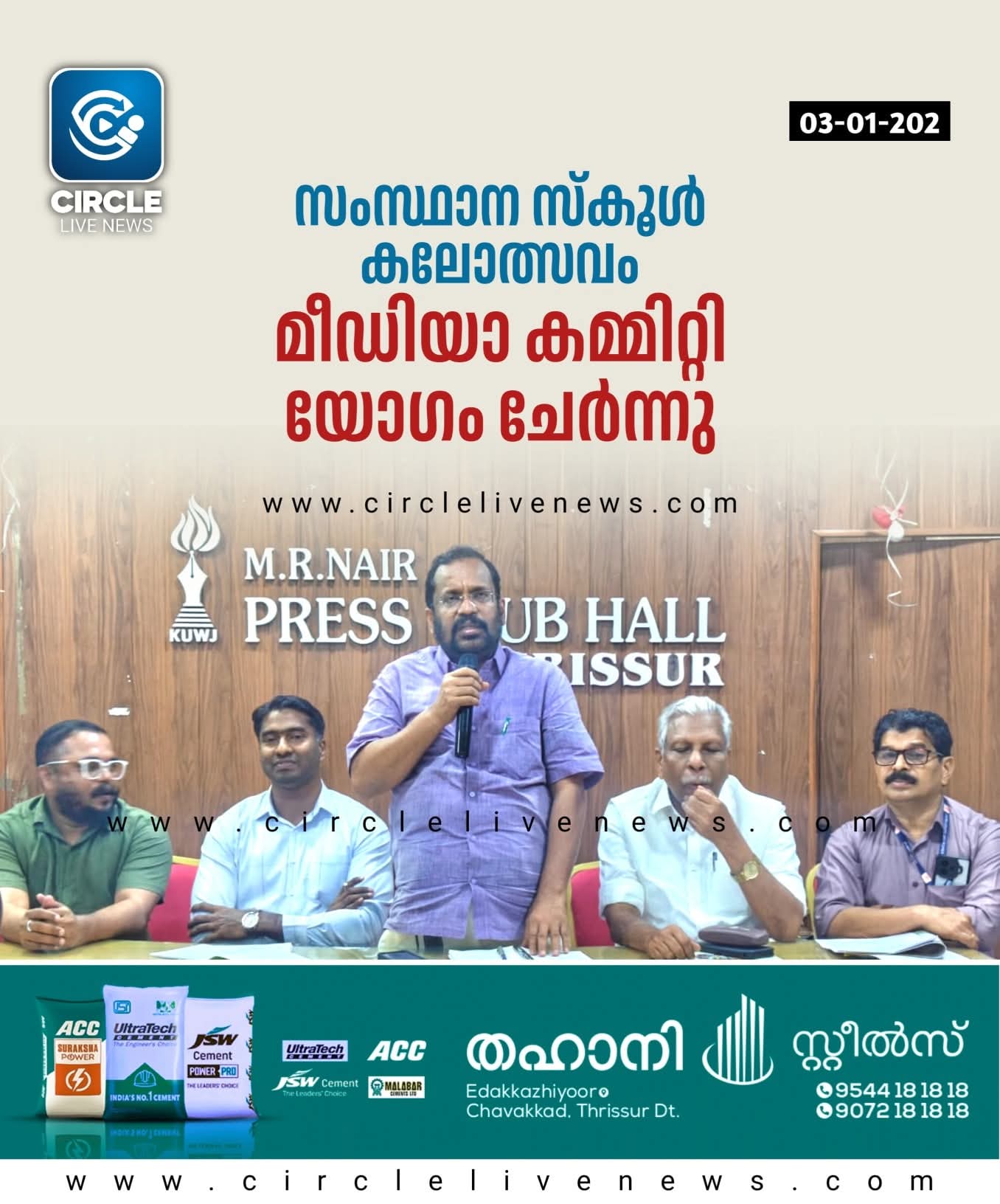 തൃശൂർ: ജനുവരി 14 മുതൽ 18 വരെ തൃശൂരിൽ നടക്കുന്ന സംസ്ഥാന സ്കൂൾ കലോത്സവത്തിൻ്റെ മീഡിയാ കമ്മിറ്റി യോഗം പ്രസ്ക്ലബ്ബിൽ ചേർന്നു. കലോത്സവ വിജയത്തിന് മാധ്യമ സമൂഹത്തിൻ്റെ എല്ലാ പിന്തുണയുമുണ്ടാവണമെന്ന് യോഗം അഭ്യർത്ഥിച്ചു. ഓരോ വേദിയിൽ നിന്നുമുള്ള മത്സര ഫലങ്ങൾ സംബന്ധിച്ച വിവരങ്ങൾ അതതു സമയം പ്രസിദ്ധീകരിക്കാൻ ഫലപ്രദമായ രീതിയിൽ മീഡിയാ സെൻ്റർ പ്രവർത്തിക്കും. കലോത്സവ റിപ്പോർട്ടിങ്ങിനെത്തുന്നമാധ്യമ പ്രവർത്തകർക്ക് മീഡിയാ പാസ്, മറ്റനുബന്ധ സൗകര്യങ്ങൾ എന്നിവ ഏർപ്പാടാക്കുന്നതിനു വേണ്ട പ്രവർത്തനങ്ങൾ നടത്തും. യോഗത്തിൽ റവന്യുമന്ത്രി കെ രാജൻ അധ്യക്ഷത വഹിച്ചു. എ.സി മൊയ്തീൻ എംഎൽഎ, ജില്ലാ കളക്ടർ അർജുൻ പാണ്ഡ്യൻ, ജില്ലാ വിദ്യാഭ്യാസ ഉപഡയറക്ടർ പി.എം. ബാലകൃഷ്ണൻ, മീഡിയാ കമ്മിറ്റി കൺവീനർ റസാഖ്, പ്രസ്ക്ലബ് സെക്രട്ടറി രഞ്ജിത് ബാലൻ തുടങ്ങിയവർ സംസാരിച്ചു.