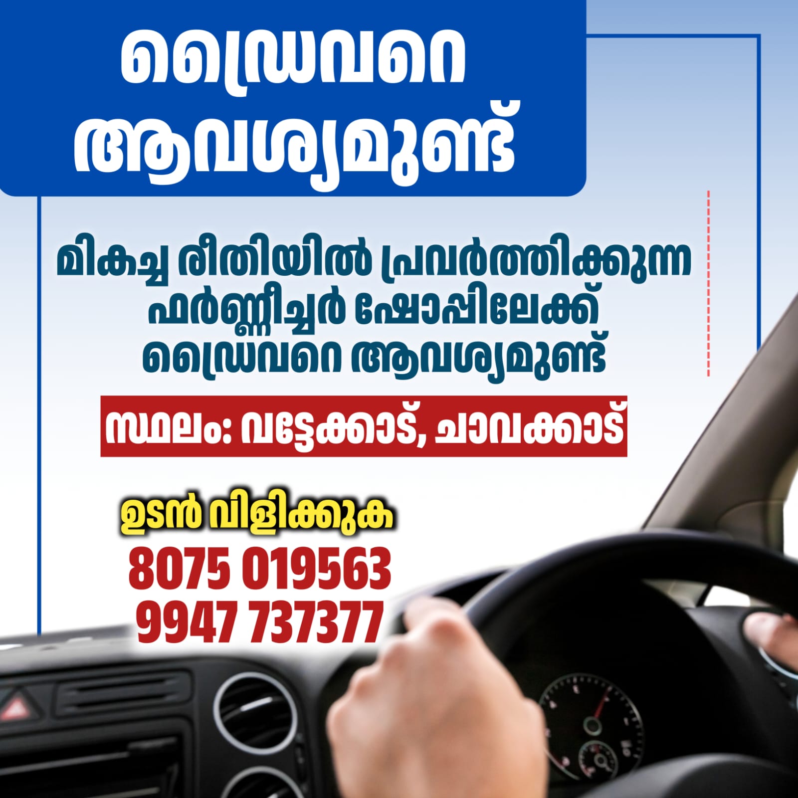 FEATUREDജോലി ഡ്രൈവറെ ആവശ്യമുണ്ട് By circlelivenews January 4, 2026 - 1:11 PM 0 0 Share FacebookTwitterPinterestWhatsApp ▪️ മികച്ച രീതിയിൽ പ്രവർത്തിക്കുന്ന ഫർണ്ണീച്ചർ ഷോപ്പിലേക്ക് ഡ്രൈവറെ ആവശ്യമുണ്ട് * സ്ഥലം – വട്ടേക്കാട്, ചാവക്കാട് ഉടൻ വിളിക്കുക8075 0195639947 737377 Tagsചാവക്കാട്തൃശൂർ Share FacebookTwitterPinterestWhatsApp Previous articleപെരിങ്ങാട് പുഴ റിസർവ് വനമാക്കിയുള്ള പ്രഖ്യാപനം റദ്ധാക്കാനുള്ള നീക്കം വനംവകുപ്പ് അട്ടിമറിക്കുന്നു’- പെരിങ്ങാട് പുഴ തീരദേശ സംരക്ഷണ സമിതി circlelivenewshttp://Circlelivenews.com RELATED ARTICLES FEATURED പെരിങ്ങാട് പുഴ റിസർവ് വനമാക്കിയുള്ള പ്രഖ്യാപനം റദ്ധാക്കാനുള്ള നീക്കം വനംവകുപ്പ് അട്ടിമറിക്കുന്നു’- പെരിങ്ങാട് പുഴ തീരദേശ സംരക്ഷണ സമിതി January 4, 2026 - 11:43 AM FEATURED വെനസ്വേലക്കെതിരെ അമേരിക്കൻ ആക്രമണം; ചാവക്കാട് സി.പി.എം പ്രതിഷേധം January 4, 2026 - 11:30 AM FEATURED കോൺഗ്രസ് പുന്നയൂർക്കുളം മണ്ഡലം ട്രഷർ പീടികപറമ്പിൽ ബാലൻ (72) നിര്യാതനായി January 4, 2026 - 1:22 AM - Advertisment - Most Popular പെരിങ്ങാട് പുഴ റിസർവ് വനമാക്കിയുള്ള പ്രഖ്യാപനം റദ്ധാക്കാനുള്ള നീക്കം വനംവകുപ്പ് അട്ടിമറിക്കുന്നു’- പെരിങ്ങാട് പുഴ തീരദേശ സംരക്ഷണ സമിതി January 4, 2026 - 11:43 AM വെനസ്വേലക്കെതിരെ അമേരിക്കൻ ആക്രമണം; ചാവക്കാട് സി.പി.എം പ്രതിഷേധം January 4, 2026 - 11:30 AM കോൺഗ്രസ് പുന്നയൂർക്കുളം മണ്ഡലം ട്രഷർ പീടികപറമ്പിൽ ബാലൻ (72) നിര്യാതനായി January 4, 2026 - 1:22 AM ആന, കുടമാറ്റം, വാദ്യമേളം, വെടിക്കെട്ട്; സ്കൂൾ കലോത്സവം വർണാഭമാക്കും January 4, 2026 - 12:48 AM Load more Recent Comments