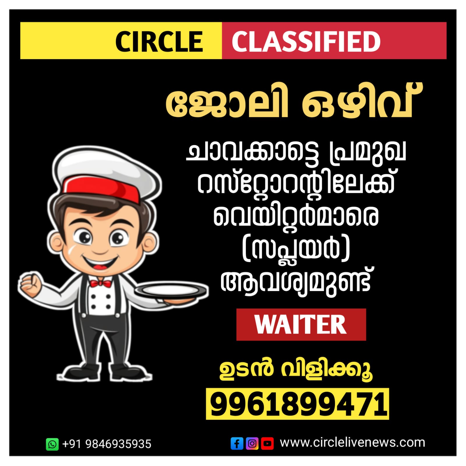 FEATUREDചാവക്കാട്ജോലി ചാവക്കാട്ടെ പ്രമുഖ റസ്റ്റോറന്റിലേക്ക് വെയിറ്റർമാരെ(സപ്ലയർ) ആവശ്യമുണ്ട് By circlelivenews January 5, 2026 - 10:13 AM 0 68 Share FacebookTwitterPinterestWhatsApp ▪️ WAITER ഉടൻ വിളിക്കൂ9961899471 Tagsചാവക്കാട്തൃശൂർ Share FacebookTwitterPinterestWhatsApp Previous articleമന്ദലാംകുന്ന് യാസീൻ പള്ളിക്ക് സമീപം താമസിച്ചിരുന്ന തണ്ണിത്തുറക്കൽ കുട്ടി ഹസ്സൻ (85) വളാഞ്ചേരിയിലുള്ള വീട്ടിൽ നിര്യാതനായിNext articleചാവക്കാട് മണത്തല സ്കൂൾ ബസ്സിന് പുതുജീവൻ; ഇനി കുട്ടികൾക്ക് ആവേശയാത്ര! circlelivenewshttp://Circlelivenews.com RELATED ARTICLES FEATURED ഡിവൈ.എഫ്.ഐ നിവേദനത്തിന് ഫലം കണ്ടു; മുതുവട്ടൂർ ചെറ്റ്യാലക്കൽ ക്ഷേത്രത്തിനടുത്ത് മിനി മാസ്റ്റ് ലൈറ്റ് അനുവദിച്ചു January 6, 2026 - 4:17 PM FEATURED പ്രമേഹം, പ്രഷർ, തൈറോയ്ഡ് തുടങ്ങിയ അസുഖങ്ങളുണ്ടോ? January 6, 2026 - 2:43 PM FEATURED കെ.എസ്.എസ്.പി.എ ജില്ല സമ്മേളനത്തിന് ഗുരുവായൂരിൽ തുടക്കം January 6, 2026 - 2:36 PM - Advertisment - Most Popular ഡിവൈ.എഫ്.ഐ നിവേദനത്തിന് ഫലം കണ്ടു; മുതുവട്ടൂർ ചെറ്റ്യാലക്കൽ ക്ഷേത്രത്തിനടുത്ത് മിനി മാസ്റ്റ് ലൈറ്റ് അനുവദിച്ചു January 6, 2026 - 4:17 PM പ്രമേഹം, പ്രഷർ, തൈറോയ്ഡ് തുടങ്ങിയ അസുഖങ്ങളുണ്ടോ? January 6, 2026 - 2:43 PM കെ.എസ്.എസ്.പി.എ ജില്ല സമ്മേളനത്തിന് ഗുരുവായൂരിൽ തുടക്കം January 6, 2026 - 2:36 PM WANTED January 6, 2026 - 1:18 PM Load more Recent Comments