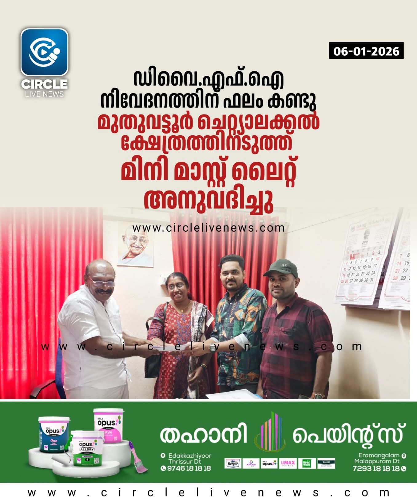 ചാവക്കാട്: മുതുവട്ടൂർ ചെറ്റ്യാലക്കൽ ക്ഷേത്രത്തിൻ്റെ സമീപം മിനി മാസ്റ്റ് ലൈറ്റ് അനുവദിച്ച് എൻ.കെ അക്ബർ എംഎൽഎ. ഡി.വൈ.എഫ്.ഐ മുതുവട്ടൂർ വെസ്റ്റ് യൂണിറ്റ് നൽകിയ നിവേദനത്തിൻ്റെ അടിസ്ഥാനത്തിലാണ് തൻ്റെ പ്രാദേശിക വികസന ഫണ്ടിൽ നിന്ന് മിനി മാസ്റ്റലൈറ്റ് സ്ഥാപിക്കാൻ എം.എൽ.എ തുക അനുവദിച്ചത്. മിനി മാസ്റ്റ് ലൈറ്റ് സ്ഥാപിക്കണമെന്നാവശ്യപ്പെട്ട് കഴിഞ്ഞ ദിവസം വാർഡ് കൗൺസിലർ കെ. റീന, ഡി.വൈ.എഫ്.ഐ മേഖല ട്രഷറർ പി.വി നഹാസ്, എം.പി ഷാനിദ് എന്നിവർ ചേർന്ന് നിവേദനം നൽകിയിരുന്നു. ഇതിന് പിന്നാലെയാണ് മിനി മാസ്റ്റിന് തുക അനുവദിച്ചതായി എം.എൽ.എ അറിയിച്ചത്.