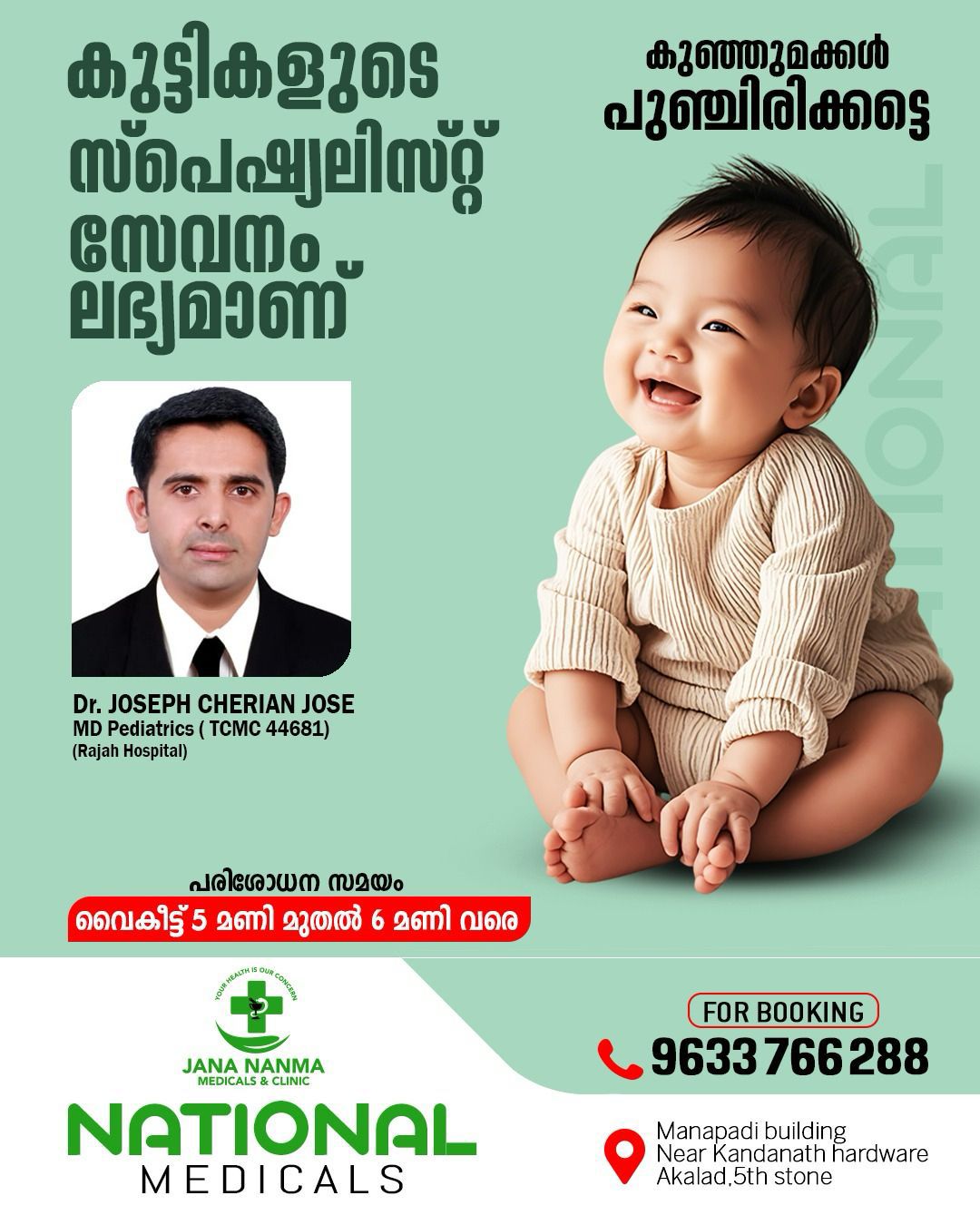 അകലാട് അഞ്ചാംകല്ല് NATIONAL Medicals ൽ കുട്ടികളുടെ സ്പെഷ്യലിസ്റ്റിൻ്റെ സേവനം ലഭ്യം