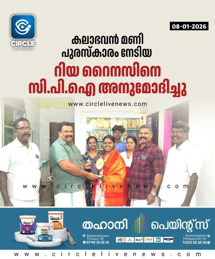 ഗുരുവായൂർ: കലാഭവൻ മണി പുരസ്കാരം നേടിയ ഗുരുവായൂർ സ്വദേശിനി റിയയെ സി.പി.ഐ മാണിക്കത്തുപടി ബ്രാഞ്ച് കമ്മറ്റി ആദരിച്ചു. സി.പി.ഐ ഗുരുവായൂർ ലോക്കൽ കമ്മറ്റി സെക്രട്ടറി എൻ.പി നാസർ പൊന്നാടയണിയിച്ച് ഉപഹാരം സമ്മാനിച്ചു. ലോക്കൽ കമ്മറ്റി അംഗം പി.വി മധു, നഗരസഭ കൗൺസിലർ ഉണ്ണികൃഷ്ണൻ കരുമത്തിൽ, ബ്രാഞ്ച് സെക്രട്ടറി ഷനുമോഹൻ എന്നിവർ പങ്കെടുത്തു. കാരക്കാട് എ.വി റൈനസ് – നിഷ ദമ്പതികളുടെ മകളായ റിയ ഗുരുവായൂർ ശ്രീകൃഷ്ണ സ്കൂളിലെ പ്ലസ് ടു വിദ്യാർഥിനിയാണ്. നൃത്തത്തിൻ്റെ വിവിധ മേഖലകളിൽ നിരവധി അംഗീകാരങ്ങൾ നേരത്തെ നേടിയിട്ടുണ്ട്.