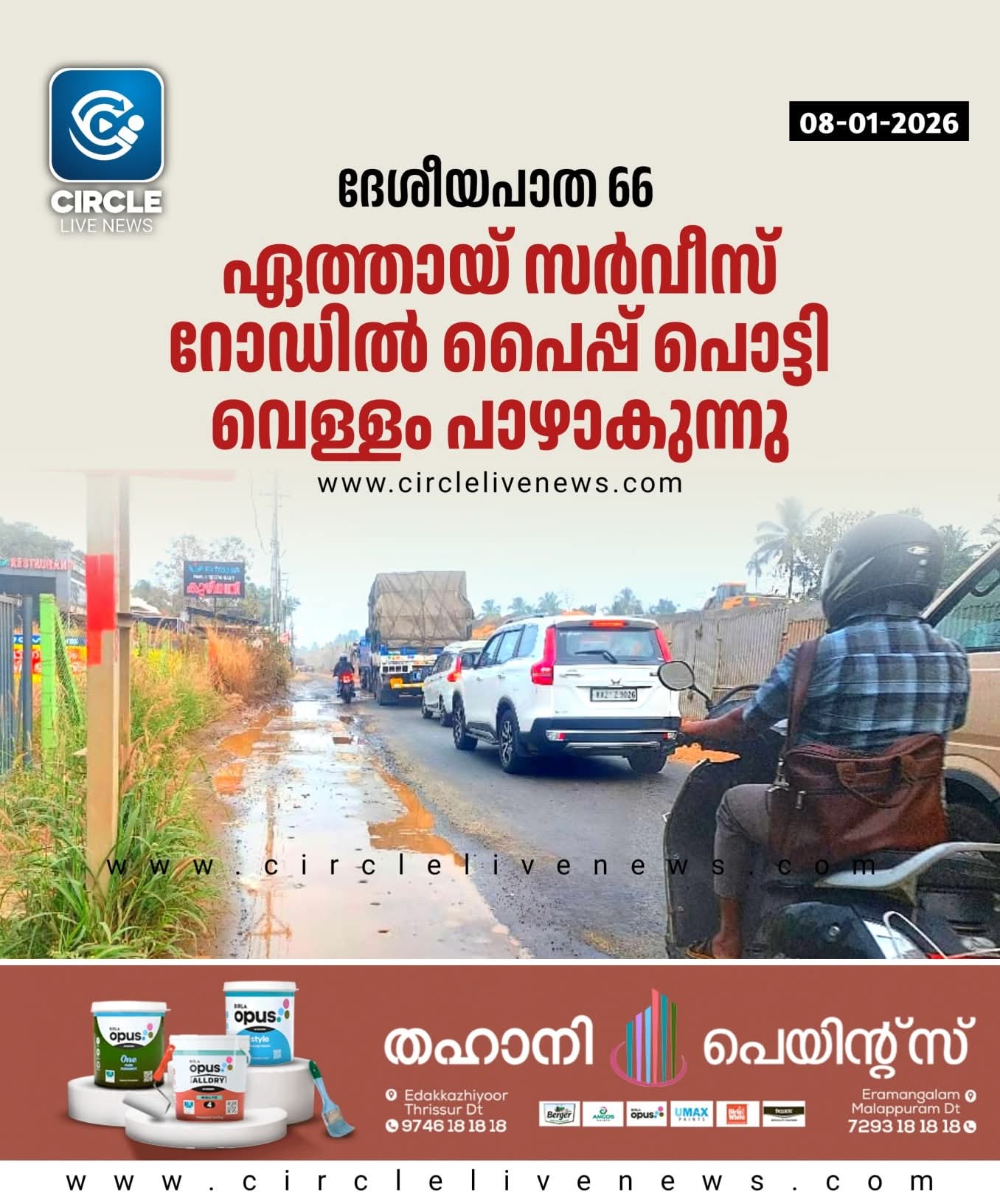ദേശീയപാത 66 ഏത്തായ് സർവീസ് റോഡിൽ പൈപ്പ് പൊട്ടി വെള്ളം പാഴാകുന്നു