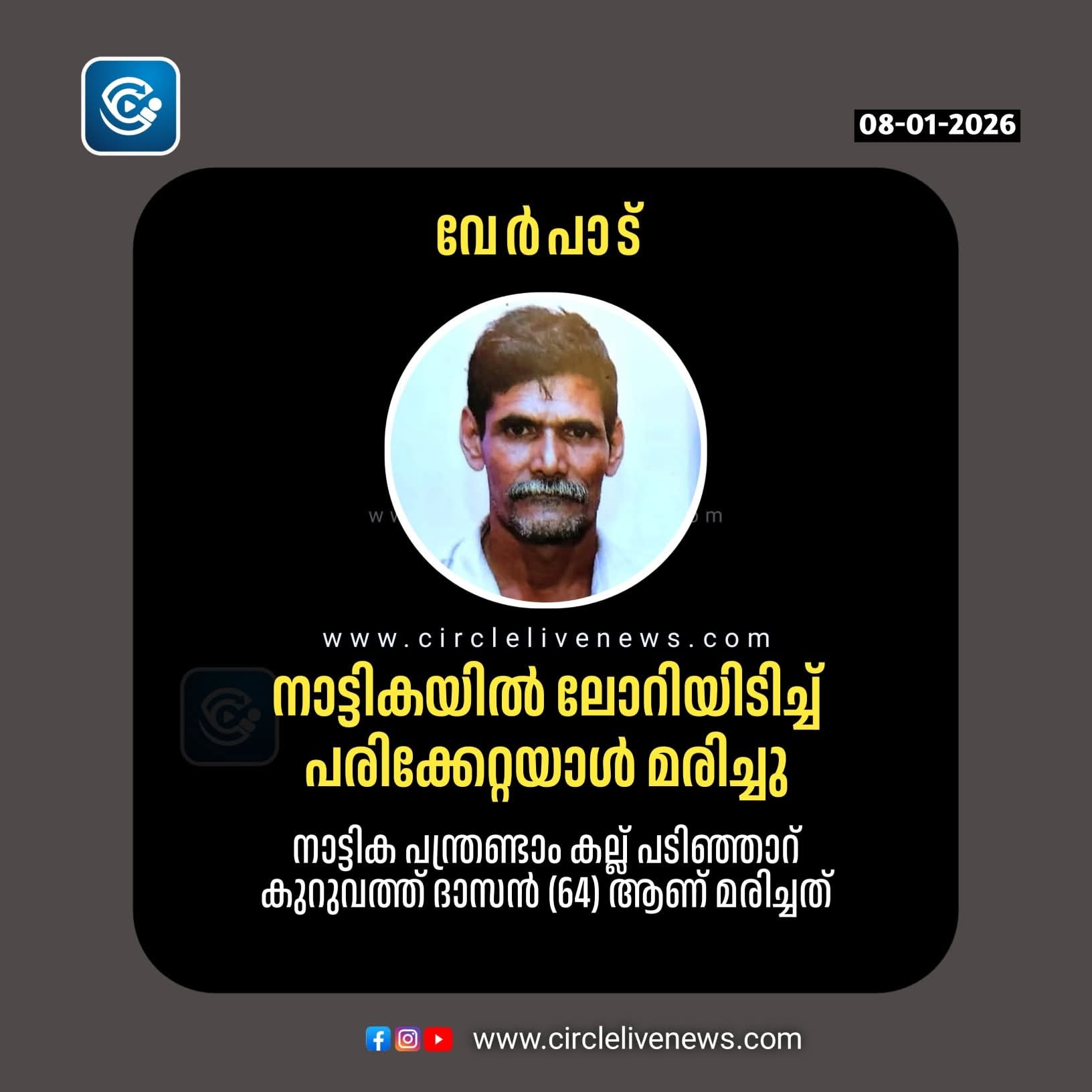 വാടാനപ്പള്ളി: നാട്ടികയിൽ ലോറിയിടിച്ച് പരിക്കേറ്റയാൾ മരിച്ചു. നാട്ടിക പന്ത്രണ്ടാം കല്ല് പടിഞ്ഞാറ് കുറുവത്ത് ദാസൻ (64) ആണ് മരിച്ചത്. ഇക്കഴിഞ്ഞ തിങ്കളാഴ്ച രാത്രി നാട്ടിക സെൻ്ററിൽ വെച്ചാണ് റോഡ് മുറിച്ച് കടക്കുന്നതിടെ ദാസനെ ദേശീയപാത അതോറിറ്റിയുടെ ലോറി ഇടിച്ചത്. ഗുരുതര പരിക്കേറ്റ് ആശുപത്രിയിൽ ചികിത്സയിലിരിക്കെ ഇന്ന് രാവിലെയായിരുന്നു മരണം സംഭവിച്ചത്.