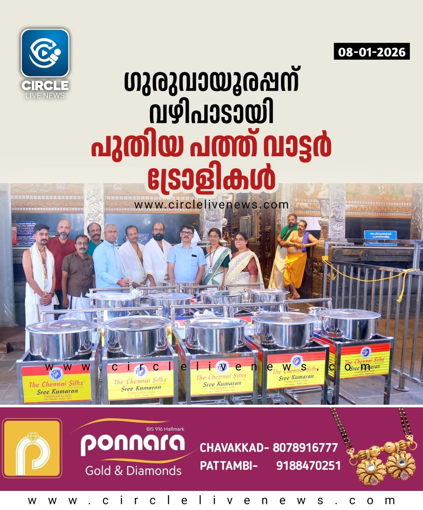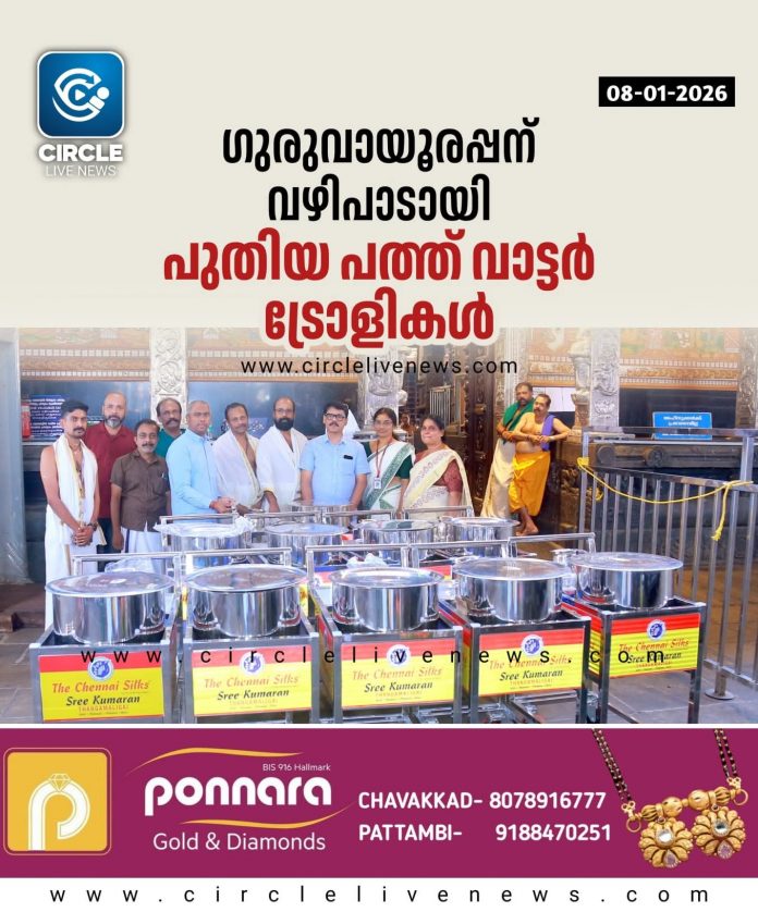 ഗുരുവായൂർ: ഗുരുവായൂരപ്പന് വഴിപാടായി പുതിയ പത്ത് വാട്ടർ ട്രോളികൾ. പൊതുവരി നിൽക്കുന്ന ഭക്തർക്ക് യഥേഷ്ടം കുടിവെള്ളമെത്തിക്കാനുള്ള വാട്ടർ ട്രോളികൾ തിരുപ്പൂർ കറുവംപാളയം ആലങ്കാട് സ്വദേശിയും ചെന്നൈ സിൽക്സ് എം.ഡിയുമായ എ പ്രസന്ന അങ്കുരാജാണ് സമർപ്പിച്ചത്. ഇന്ന് രാവിലെ രാവിലെ കിഴക്കേ ഗോപുരത്തിന് മുന്നിൽ നടന്ന ചടങ്ങിൽ ദേവസ്വം ഭരണ സമിതി അംഗം സി. മനോജ് വാട്ടർ ട്രോളികൾ ഏറ്റുവാങ്ങി. ക്ഷേത്രം ഡെപ്യൂട്ടി അഡ്മിനിസ്ട്രേറ്റർ പ്രമോദ് കളരിക്കൽ, അസിസ്റ്റന്റ് മാനേജർ സി.ആർ ലെജുമോൾ, ചീഫ് സെക്യുരിറ്റി ഓഫീസർ മോഹൻകുമാർ, ഹെൽത്ത് സൂപ്പർ വൈസർ എം.എൻ രാജീവ്, ജീവനക്കാർ എന്നിൻ സന്നിഹിതരായി. വരി നിൽക്കുന്ന ഭക്ത ജനങ്ങൾക്കരികിൽ കുടിവെള്ളം എത്തിച്ചു നൽകാൻ ഈ വാട്ടർ ട്രോളികൾ ഉപയോഗിക്കും.