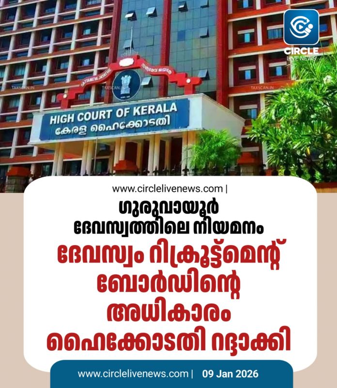 കൊച്ചി: ഗുരുവായൂർ ദേവസ്വത്തിൽ നിയമനങ്ങൾ നടത്താൻ മാനേജിങ് കമ്മിറ്റിക്കാണ് അധികാരമെന്ന് ഹൈകോടതി. ഗുരുവായൂരിലെ നിയമനങ്ങളിൽനിന്ന് കേരള ദേവസ്വം റിക്രൂട്ട്മെന്റ് ബോർഡിനെ (കെ.ഡി.ആർ.ബി) ഒഴിവാക്കിയാണ് ജസ്റ്റിസ് എസ്.എ. ധർമാധികാരി, ജസ്റ്റിസ് വി.എം. ശ്യാംകുമാർ എന്നിവരടങ്ങുന്ന ഡിവിഷൻബെഞ്ചിന്റെ ഉത്തരവ്. ഗുരുവായൂർ ദേവസ്വത്തിലും അനുബന്ധ എയ്ഡഡ് സ്ഥാപനങ്ങളിലും വിവിധ തസ്തികകളിലേക്ക് അപേക്ഷ ക്ഷണിച്ച് റിക്രൂട്ട്മെന്റ് ബോർഡ് പുറപ്പെടുവിച്ച പുതിയ വിജ്ഞാപനങ്ങളും കോടതി റദ്ദാക്കി. ദേവസ്വം മാനേജിങ് കമ്മിറ്റി നിയമാനുസൃതമായി പുതിയ വിജ്ഞാപനം പുറപ്പെടുവിച്ച് നിയമന നടപടികൾ ആരംഭിക്കാനും കോടതി നിർദേശിച്ചു. റിക്രൂട്ട്മെന്റ് ബോർഡ് നിയമനവ്യവസ്ഥ ശരിവെച്ച സിംഗിൾബെഞ്ച് ഉത്തരവിനെതിരെ ഗുരുവായൂർ ദേവസ്വം എംപ്ലോയീസ് യൂനിയൻ കോൺഗ്രസ് അടക്കമുള്ളവർ അഡ്വ. ജാജു ബാബു മുഖേന സമർപ്പിച്ച അപ്പീലുകളാണ് കോടതി പരിഗണിച്ചത്. മാനേജിങ് കമ്മിറ്റിക്ക് അധികാരം നൽകുന്ന 1978ലെ ഗുരുവായൂർ ദേവസ്വം നിയമത്തിലെ 19ാം വകുപ്പിനാണ് നിയമസാധുതയെന്ന് കോടതി വ്യക്തമാക്കി. തുടർന്ന് നിയമനങ്ങൾ സംബന്ധിച്ച റിക്രൂട്ട്മെന്റ് ബോർഡ് നിയമത്തിലെ ഒമ്പതാം വകുപ്പ് ഭരണഘടനാവിരുദ്ധമാണെന്ന് വിലയിരുത്തി കോടതി റദ്ദാക്കി.