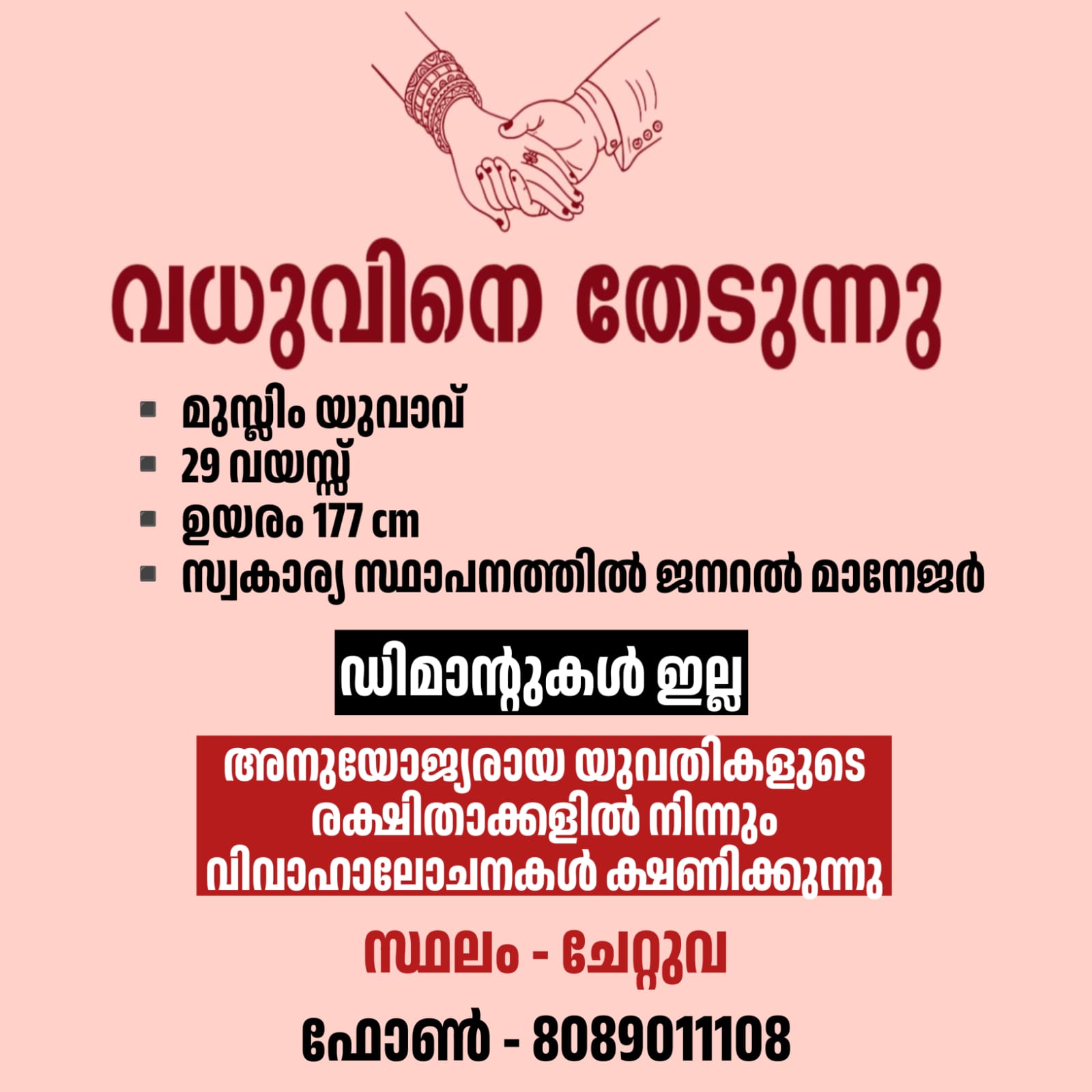 FEATURED വധുവിനെ തേടുന്നു By circlelivenews January 10, 2026 - 3:24 PM 0 1 Share FacebookTwitterPinterestWhatsApp – മുസ്ലിം യുവാവ് – 29 വയസ്സ് * ഉയരം – 177 cm * സ്വകാര്യ സ്ഥാപനത്തിൽ ജനറൽ മാനേജർ *ഡിമാൻ്റുകൾ ഇല്ല* *അനുയോജ്യരായ യുവതികളുടെ രക്ഷിതാക്കളിൽ നിന്നും വിവാഹാലോചനകൾ ക്ഷണിക്കുന്നു* ▪️ *സ്ഥലം – ചേറ്റുവ* *ഫോൺ – 8089011108* Tagsചാവക്കാട്തൃശൂർ Share FacebookTwitterPinterestWhatsApp Previous articleവിദ്യാർഥിനിയുടെ കാലിൽ തറച്ച കോൺക്രീറ്റ് കഷണം നീക്കാതെ തുന്നിക്കെട്ടിയതായി പരാതി circlelivenewshttp://Circlelivenews.com RELATED ARTICLES FEATURED വിദ്യാർഥിനിയുടെ കാലിൽ തറച്ച കോൺക്രീറ്റ് കഷണം നീക്കാതെ തുന്നിക്കെട്ടിയതായി പരാതി January 10, 2026 - 9:07 AM FEATURED ഗുരുവായൂർ ദേവസ്വത്തിലെ നിയമനം: ദേവസ്വം റിക്രൂട്ട്മെന്റ് ബോർഡിന്റെ അധികാരം ഹൈക്കോടതി റദ്ദാക്കി January 9, 2026 - 11:59 PM FEATURED കടപ്പുറം പഞ്ചായത്തിൽ സ്റ്റാൻഡിങ് കമ്മിറ്റി ചെയർമാൻമാരെ തിരഞ്ഞെടുത്തു January 9, 2026 - 6:20 PM - Advertisment - Most Popular വിദ്യാർഥിനിയുടെ കാലിൽ തറച്ച കോൺക്രീറ്റ് കഷണം നീക്കാതെ തുന്നിക്കെട്ടിയതായി പരാതി January 10, 2026 - 9:07 AM ഗുരുവായൂർ ദേവസ്വത്തിലെ നിയമനം: ദേവസ്വം റിക്രൂട്ട്മെന്റ് ബോർഡിന്റെ അധികാരം ഹൈക്കോടതി റദ്ദാക്കി January 9, 2026 - 11:59 PM കടപ്പുറം പഞ്ചായത്തിൽ സ്റ്റാൻഡിങ് കമ്മിറ്റി ചെയർമാൻമാരെ തിരഞ്ഞെടുത്തു January 9, 2026 - 6:20 PM ജോലി വേണാ? നിരവധി ഒഴിവുകൾ January 9, 2026 - 3:05 PM Load more Recent Comments