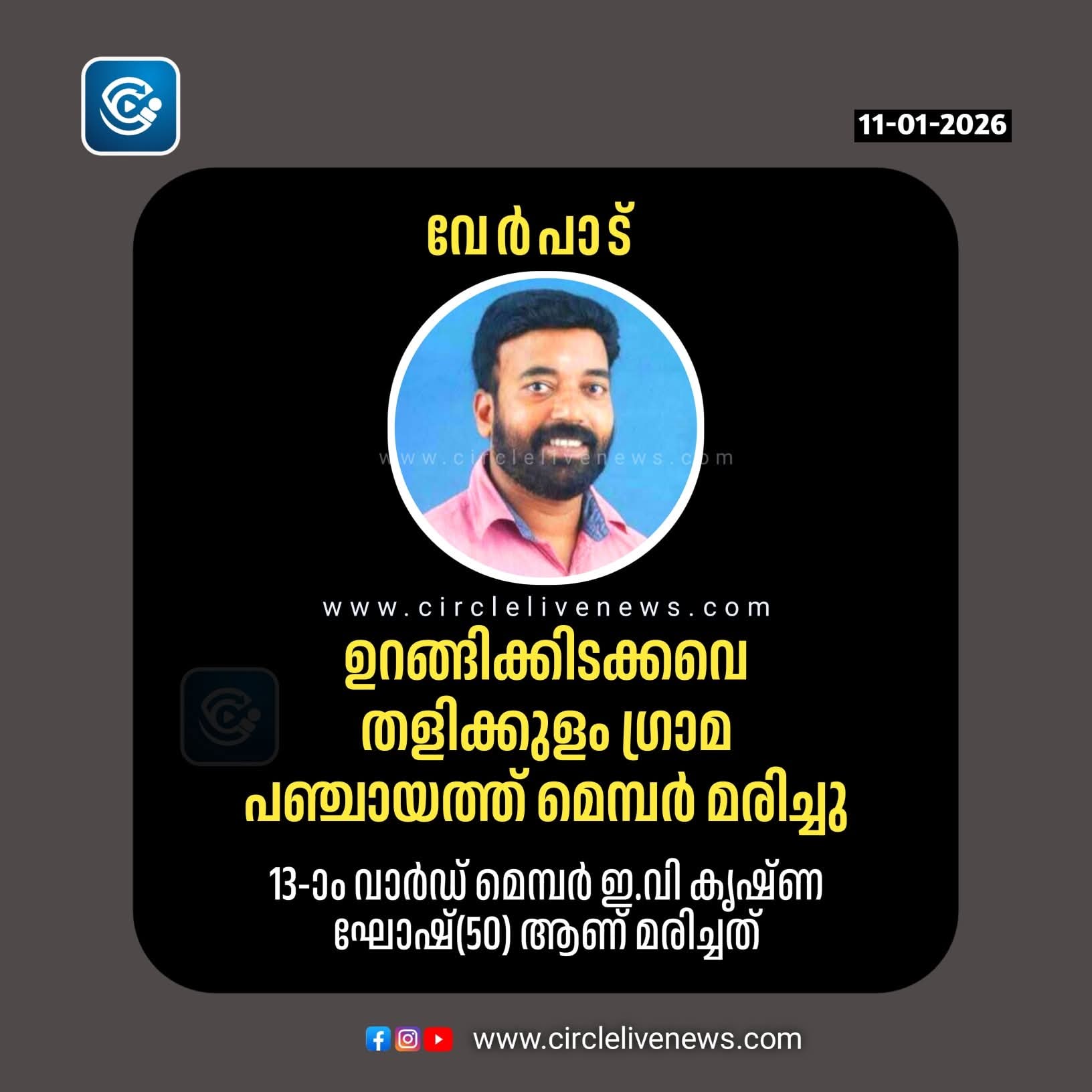 വാടാനപ്പള്ളി: ഉറങ്ങിക്കിടക്കവേ തളിക്കുളം ഗ്രാമ പഞ്ചായത്ത് മെമ്പർ മരിച്ചു. 13-ാം വാർഡ് മെമ്പറും സി.പി.എം തമ്പാൻകടവ് ബ്രാഞ്ച് സെക്രട്ടറിയുമായ ഇ.വി.കൃഷ്ണ ഘോഷ്(50) ആണ് മരിച്ചത്. ഇന്ന് പുലർച്ചെ4.30 ഓടെ ഭാര്യ ഉണർന്നപ്പോൾ അനക്കമില്ലാത്ത നിലയിൽ കാണുകയായിരുന്നു. ഉടനെ വലപ്പാട് സ്വകാര്യ ക്ലിനിക്കിൽ എത്തിച്ചെങ്കിലും അതിനു മുമ്പേ മരണം സംഭവിച്ചിരുന്നു. സംസ്കാരം പോസ്റ്റ്മോർട്ടം നടപടികൾക്ക് ശേഷം നടക്കും. ഭാര്യ: വിജി. മക്കൾ: വിഷ്ണുദത്ത് (നഴ്സിങ് വിദ്യാർഥി, ബംഗളുരു), വിനായക് (വിദ്യാർഥി, എസ്. എൻ. ട്രസ്റ്റ് സ്കൂൾ, നാട്ടിക).