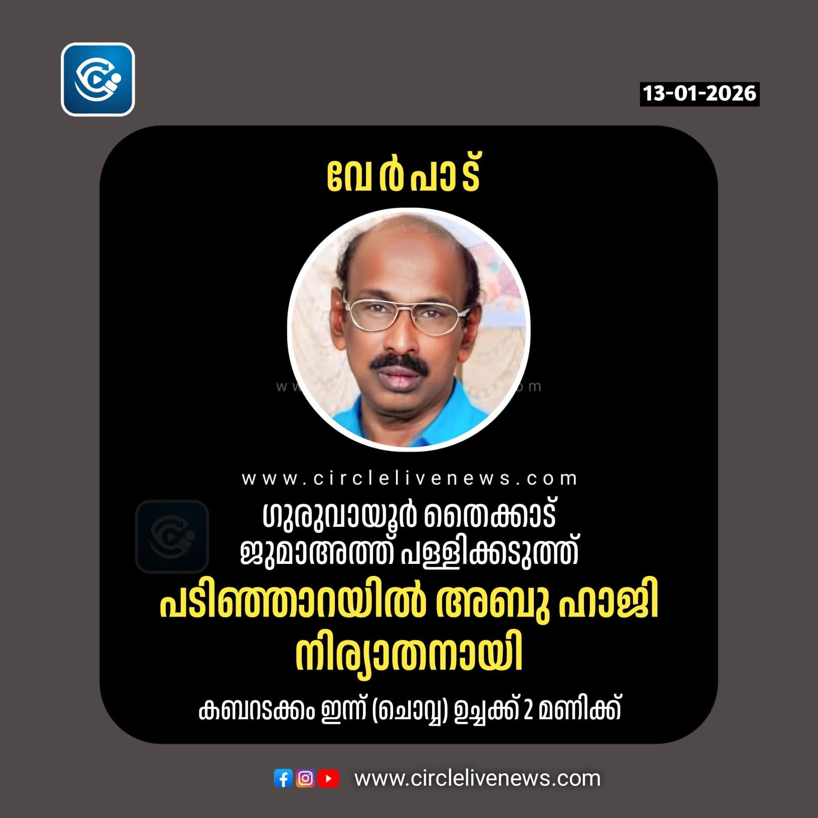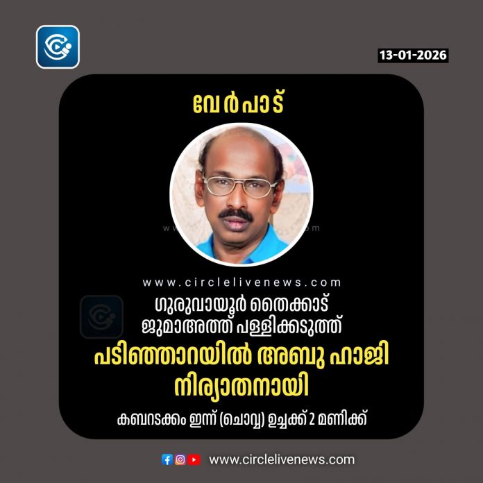 ഗുരുവായൂർ തൈക്കാട് ജുമാഅത്ത് പള്ളിക്കടുത്ത് പടിഞ്ഞാറയിൽ അബു ഹാജി നിര്യാതനായി