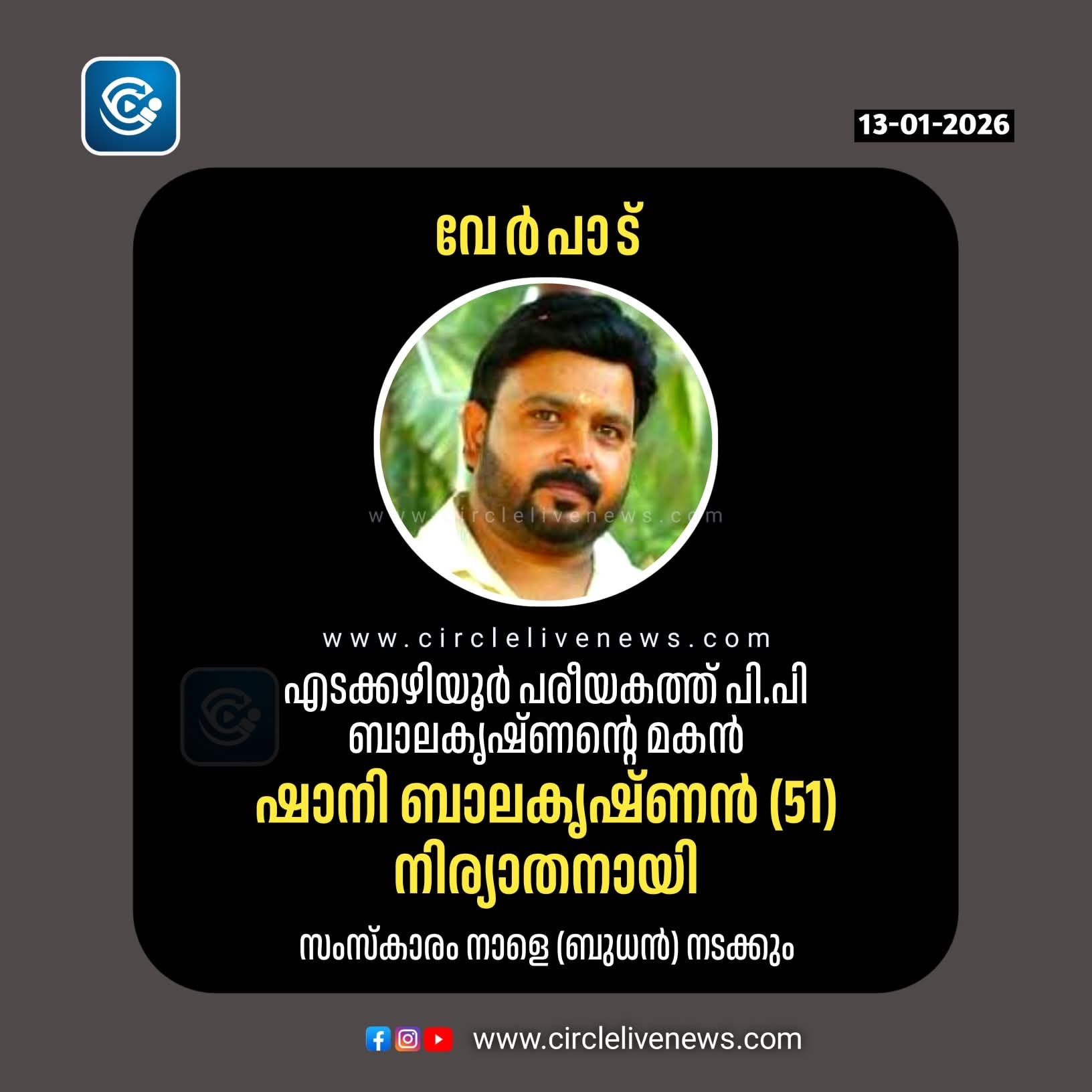 എടക്കഴിയൂർ പരീയകത്ത് പി.പി ബാലകൃഷ്ണൻ മകൻ്റെ ഷാനി ബാലകൃഷ്ണൻ (51) നിര്യാതനായി