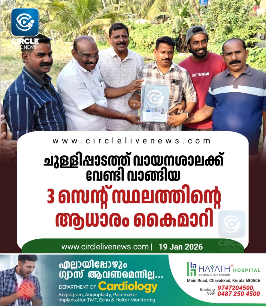 ചുള്ളിപ്പാടത്ത് വായനശാലക്ക് വേണ്ടി വാങ്ങിയ 3 സെന്റ് സ്ഥലത്തിന്റെ ആധാരം കൈമാറി